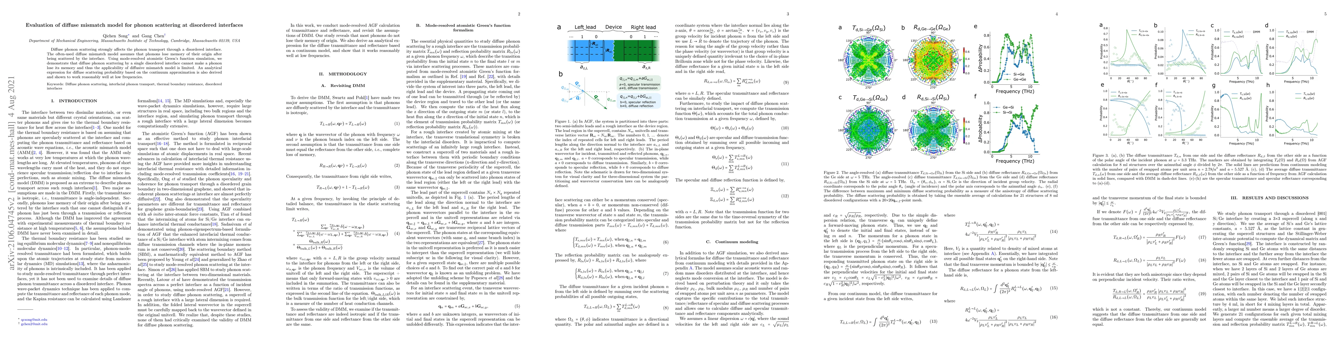 This research challenges the diffuse mismatch model for phonon scattering at disordered interfaces, showing through simulations that phonons retain origin memory post-scattering. An analytical expression for diffuse scattering probability is derived, valid at low frequencies.