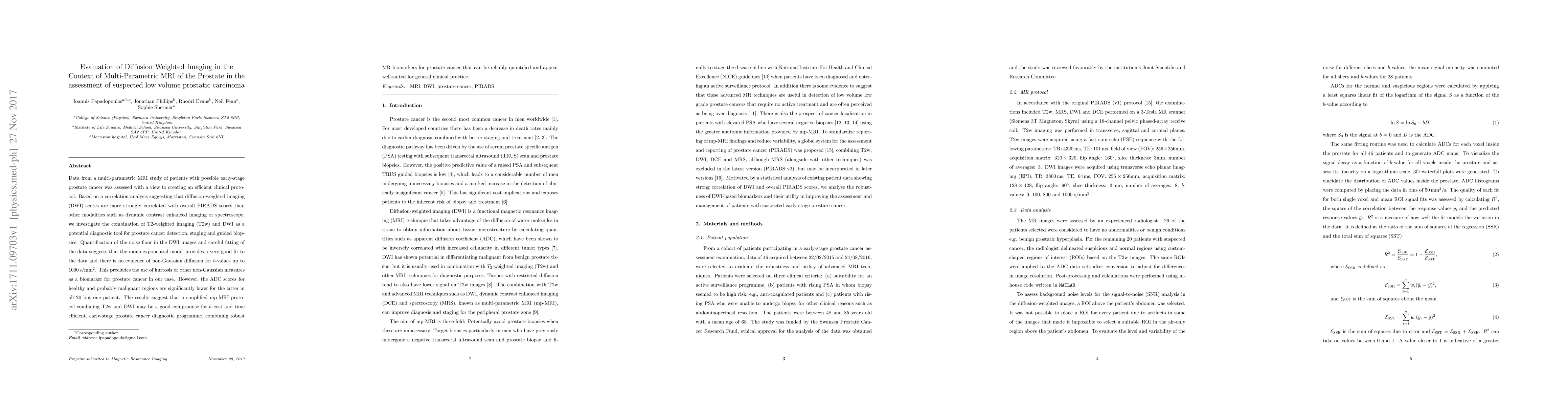 Data from a multi-parametric MRI study of patients with possible early-stage prostate cancer was assessed with a view to creating an efficient clinical protocol. Based on a correlation analysis suggesting that diffusion-weighted imaging (DWI) scores are more strongly correlated with overall PIRADS scores than other modalities such as dynamic contrast enhanced imaging or spectroscopy, we investigate the combination of T2-weighted imaging (T2w) and DWI as a potential diagnostic tool for prostate cancer detection, staging and guided biopsies. Quantification of the noise floor in the DWI images and careful fitting of the data suggests that the mono-exponential model provides a very good fit to the data and there is no evidence of non-Gaussian diffusion for $b$-values up to 1000 s/mm$^2$. This precludes the use of kurtosis or other non-Gaussian measures as a biomarker for prostate cancer in our case. However, the ADC scores for healthy and probably malignant regions are significantly lower for the latter in all 20 but one patient. The results suggest that a simplified mp-MRI protocol combining T2w and DWI may be a good compromise for a cost and time efficient, early-stage prostate cancer diagnostic programme, combining robust MR biomarkers for prostate cancer that can be reliably quantified and appear well-suited for general clinical practice.