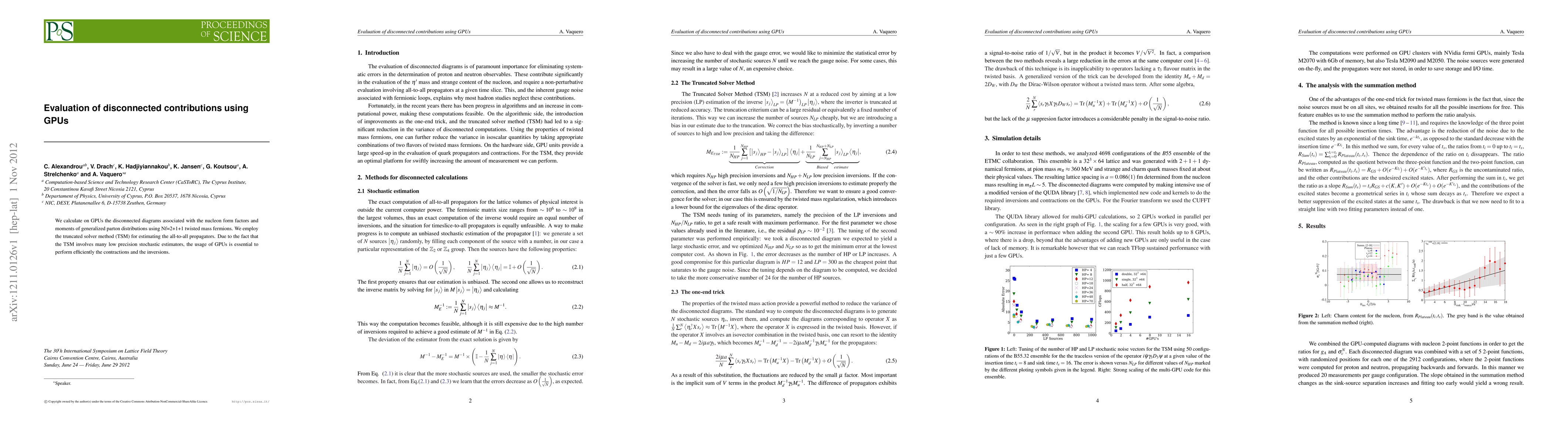 We calculate on GPUs the disconnected diagrams associated with the nucleon form factors and moments of generalized parton distributions using Nf=2+1+1 twisted mass fermions. We employ the truncated solver method (TSM) for estimating the all-to-all propagators. Due to the fact that the TSM involves many low precision stochastic estimators, the usage of GPUs is essential to perform efficiently the contractions and the inversions.