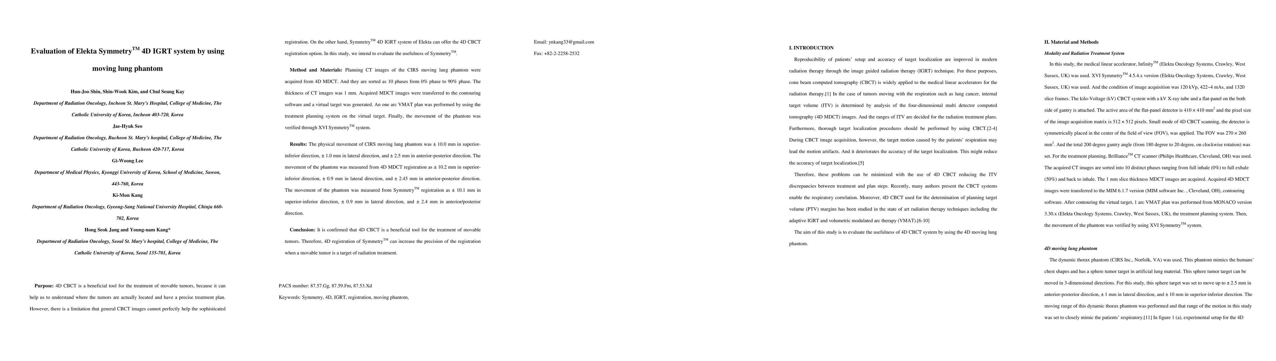 Purpose: 4D CBCT is a beneficial tool for the treatment of movable tumors, because it can help us to understand where the tumors are actually located and have a precise treatment plan. However, there is a limitation that general CBCT images cannot perfectly help the sophisticated registration. On the other hand, SymmetryTM 4D IGRT system of Elekta can offer the 4D CBCT registration option. In this study, we intend to evaluate the usefulness of SymmetryTM. Method and Materials: Planning CT images of the CIRS moving lung phantom were acquired from 4D MDCT. And they are sorted as 10 phases from 0% phase to 90% phase. The thickness of CT images was 1 mm. Acquired MDCT images were transferred to the contouring software and a virtual target was generated. An one arc VMAT plan was performed by using the treatment planning system on the virtual target. Finally, the movement of the phantom was verified through XVI SymmetryTM system. Results: The physical movement of CIRS moving lung phantom was +/- 10.0 mm in superior-inferior direction, +/- 1.0 mm in lateral direction, and +/- 2.5 mm in anterior-posterior direction. The movement of the phantom was measured from 4D MDCT registration as +/- 10.2 mm in superior-inferior direction, +/- 0.9 mm in lateral direction, and +/- 2.45 mm in anterior-posterior direction. The movement of the phantom was measured from SymmetryTM registration as +/- 10.1 mm in superior-inferior direction, +/- 0.9 mm in lateral direction, and +/- 2.4 mm in anterior/posterior direction. Conclusion: It is confirmed that 4D CBCT is a beneficial tool for the treatment of movable tumors. Therefore, 4D registration of SymmetryTM can increase the precision of the registration when a movable tumor is a target of radiation treatment.
