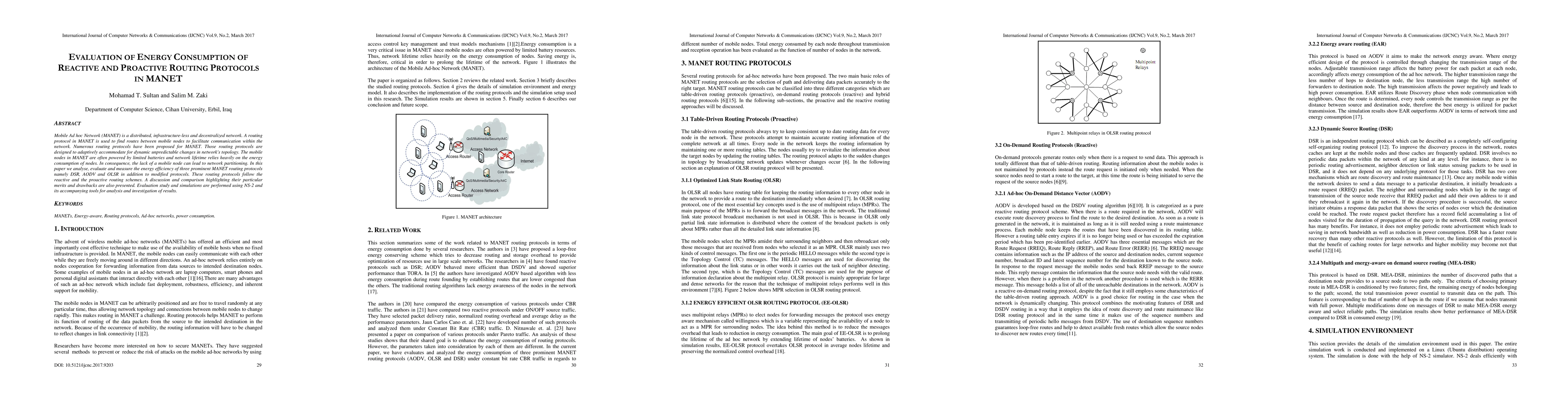 This paper evaluates the energy consumption of three prominent MANET routing protocols—DSR, AODV, and OLSR—focusing on their reactive and proactive schemes. Using NS-2 simulations, the study compares their energy efficiency and discusses their respective merits and drawbacks.