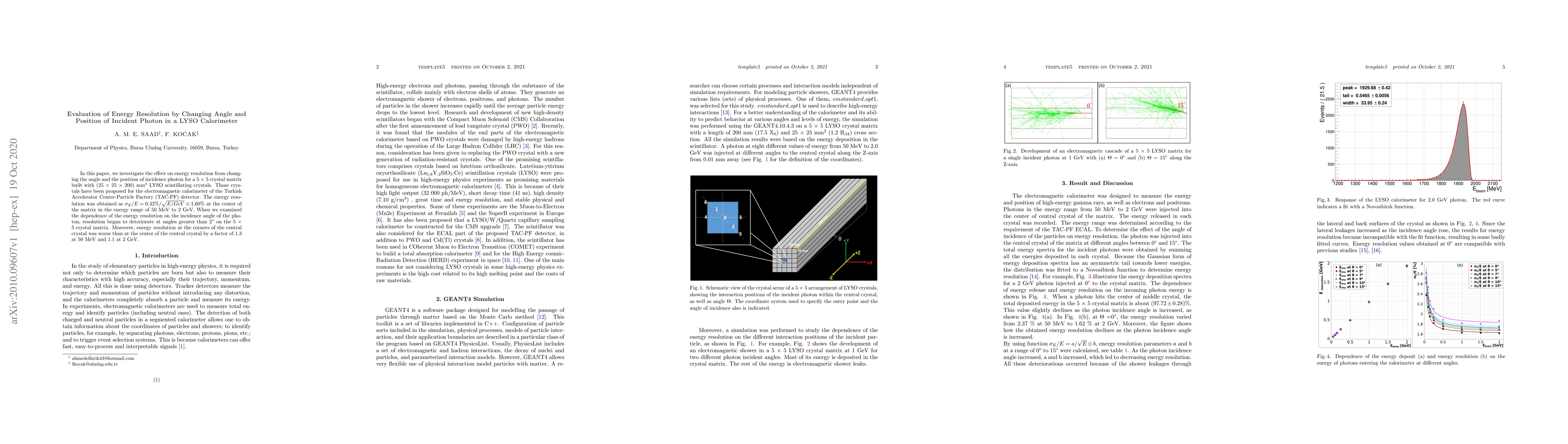 Researchers investigated how changing the angle and position of incident photons affects energy resolution in a LYSO calorimeter, finding that energy resolution degrades at angles greater than 2 degrees and varies by location within the crystal matrix.