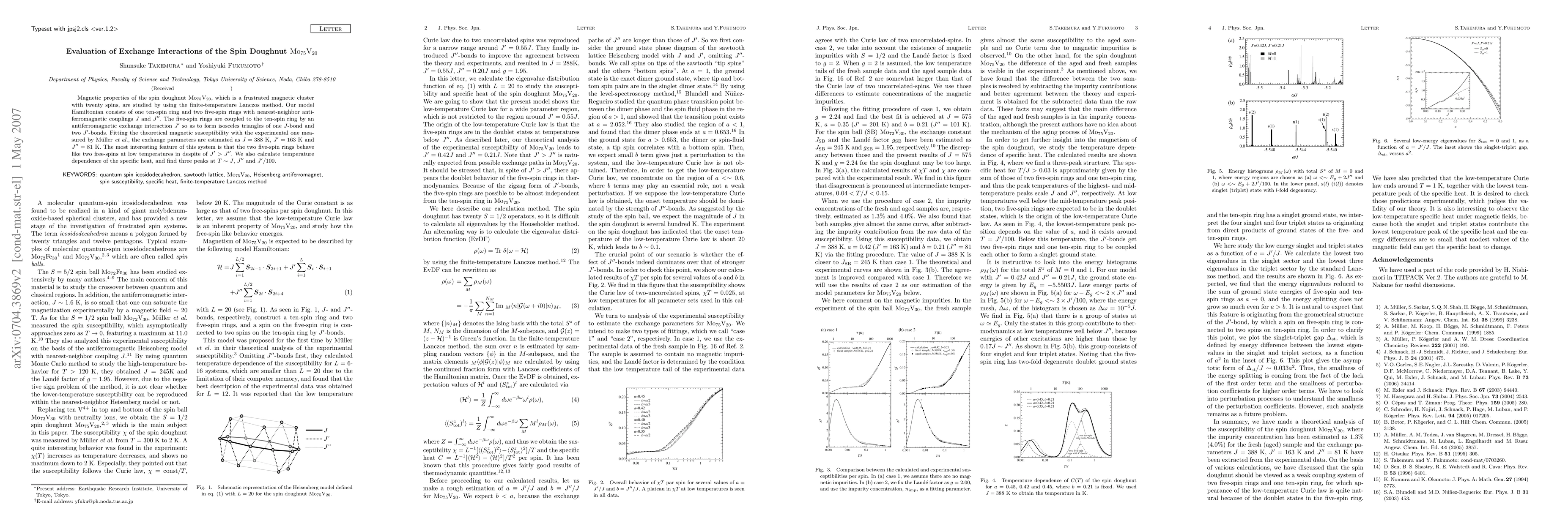 Magnetic properties of the spin doughnut Mo_{75}V_{20}, which is a frustrated magnetic cluster with twenty spins, are studied by using the finite-temperature Lanczos method. Our model Hamiltonian consists of one ten-spin ring and two five-spin rings with nearest-neighbor antiferromagnetic couplings J and J". The five-spin rings are coupled to the ten-spin ring by an antiferromagnetic exchange interaction J' so as to form isosceles triangles of one J-bond and two J'-bonds. Fitting the theoretical magnetic susceptibility with the experimental one measured by Muller et al., the exchange parameters are estimated as J=388 K, J'=163 K and J"=81 K. The most interesting feature of this system is that the two five-spin rings behave like two free-spins at low temperatures in despite of J'>J". We also calculate temperature dependence of the specific heat, and find three peaks at T sim J, J" and J'/100.