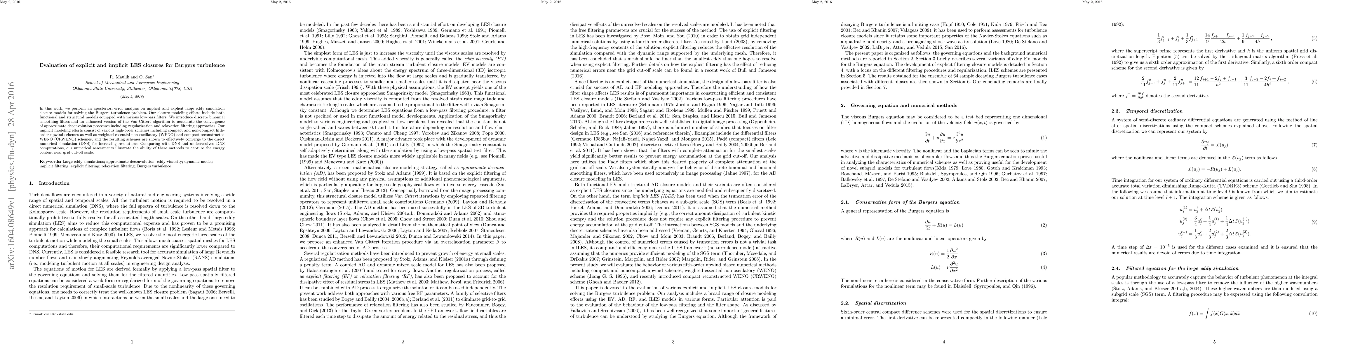 Researchers evaluate explicit and implicit large eddy simulation closure models for solving Burgers turbulence, finding that these methods can effectively capture energy content near grid cut-off scale.