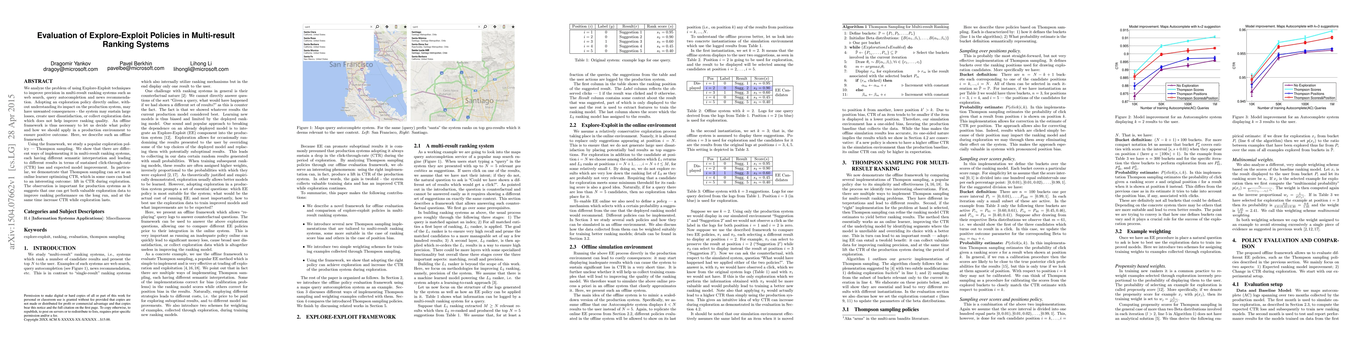 We analyze the problem of using Explore-Exploit techniques to improve precision in multi-result ranking systems such as web search, query autocompletion and news recommendation. Adopting an exploration policy directly online, without understanding its impact on the production system, may have unwanted consequences - the system may sustain large losses, create user dissatisfaction, or collect exploration data which does not help improve ranking quality. An offline framework is thus necessary to let us decide what policy and how we should apply in a production environment to ensure positive outcome. Here, we describe such an offline framework. Using the framework, we study a popular exploration policy - Thompson sampling. We show that there are different ways of implementing it in multi-result ranking systems, each having different semantic interpretation and leading to different results in terms of sustained click-through-rate (CTR) loss and expected model improvement. In particular, we demonstrate that Thompson sampling can act as an online learner optimizing CTR, which in some cases can lead to an interesting outcome: lift in CTR during exploration. The observation is important for production systems as it suggests that one can get both valuable exploration data to improve ranking performance on the long run, and at the same time increase CTR while exploration lasts.