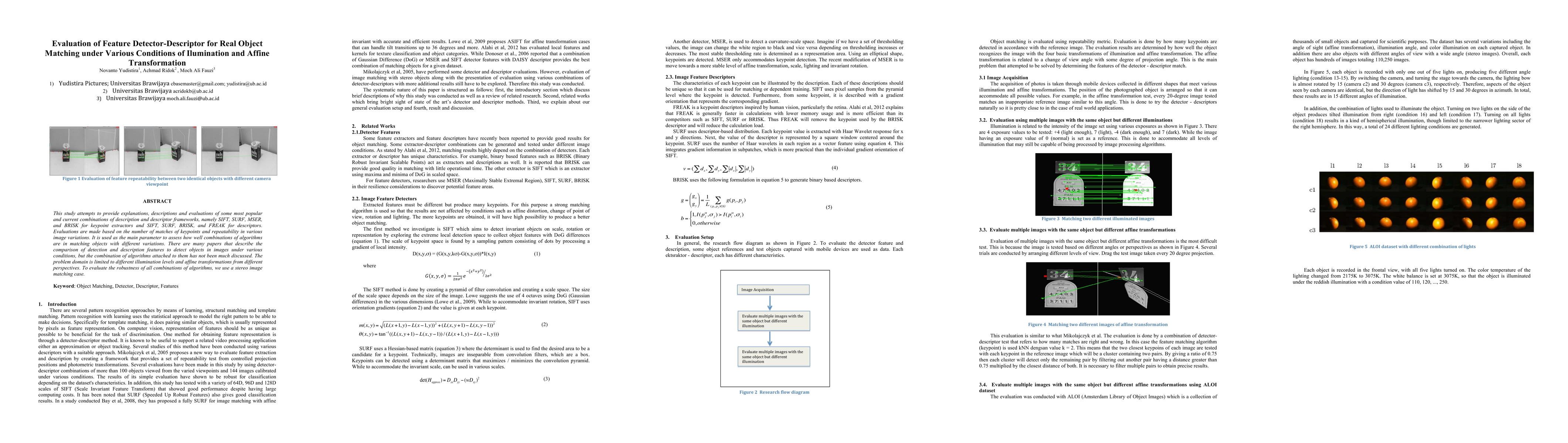 This study attempts to provide explanations, descriptions and evaluations of some most popular and current combinations of description and descriptor frameworks, namely SIFT, SURF, MSER, and BRISK for keypoint extractors and SIFT, SURF, BRISK, and FREAK for descriptors. Evaluations are made based on the number of matches of keypoints and repeatability in various image variations. It is used as the main parameter to assess how well combinations of algorithms are in matching objects with different variations. There are many papers that describe the comparison of detection and description features to detect objects in images under various conditions, but the combination of algorithms attached to them has not been much discussed. The problem domain is limited to different illumination levels and affine transformations from different perspectives. To evaluate the robustness of all combinations of algorithms, we use a stereo image matching case.