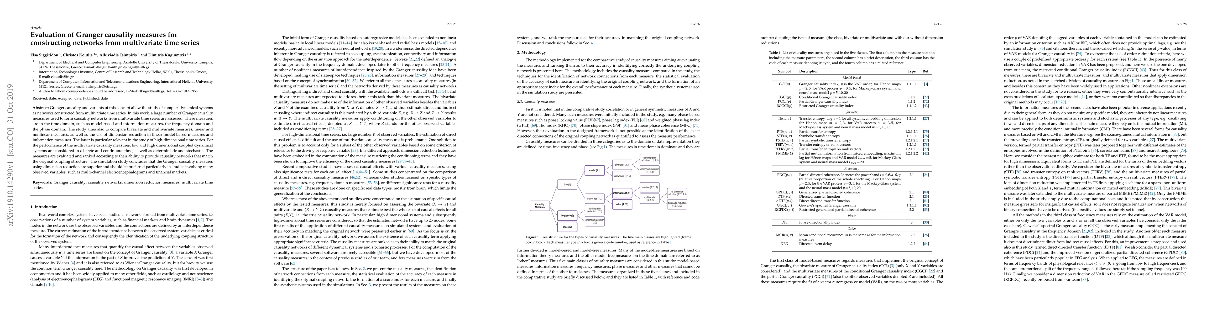 Granger causality and variants of this concept allow the study of complex dynamical systems as networks constructed from multivariate time series. In this work, a large number of Granger causality measures used to form causality networks from multivariate time series are assessed. These measures are in the time domain, such as model-based and information measures, the frequency domain and the phase domain. The study aims also to compare bivariate and multivariate measures, linear and nonlinear measures, as well as the use of dimension reduction in linear model-based measures and information measures. The latter is particular relevant in the study of high-dimensional time series. For the performance of the multivariate causality measures, low and high dimensional coupled dynamical systems are considered in discrete and continuous time, as well as deterministic and stochastic. The measures are evaluated and ranked according to their ability to provide causality networks that match the original coupling structure. The simulation study concludes that the Granger causality measures using dimension reduction are superior and should be preferred particularly in studies involving many observed variables, such as multi-channel electroencephalograms and financial markets.