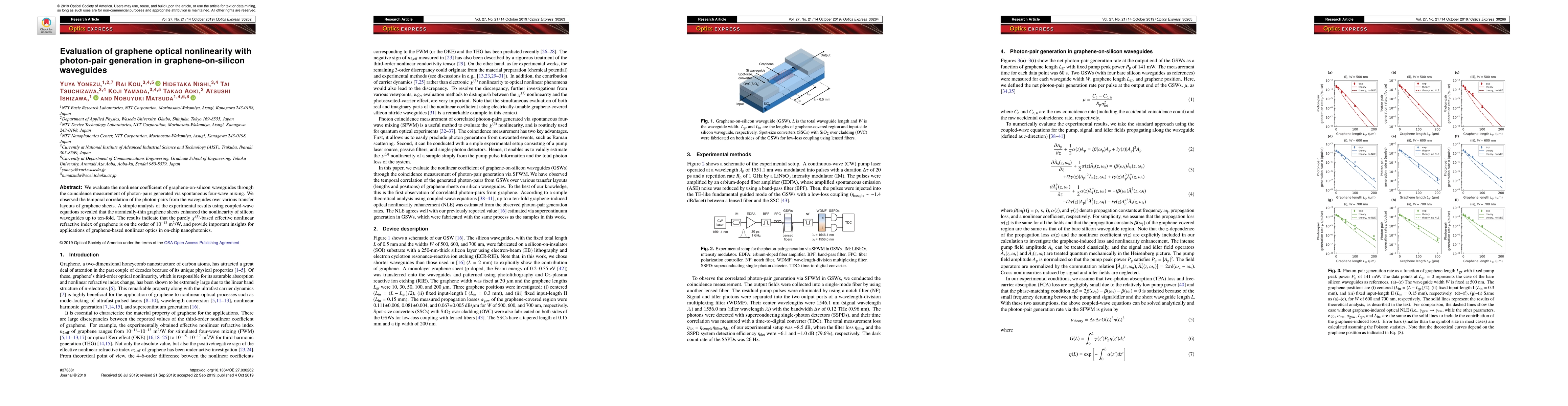 We evaluate the nonlinear coefficient of graphene-on-silicon waveguides through the coincidence measurement of photon-pairs generated via spontaneous four-wave mixing. We observed the temporal correlation of the photon-pairs from the waveguides over various transfer layouts of graphene sheets. A simple analysis of the experimental results using coupled-wave equations revealed that the atomically-thin graphene sheets enhanced the nonlinearity of silicon waveguides up to ten-fold. The results indicate that the purely $\chi^{(3)}$-based effective nonlinear refractive index of graphene is on the order of $10^{-13}$ m$^2$/W, and provide important insights for applications of graphene-based nonlinear optics in on-chip nanophotonics.