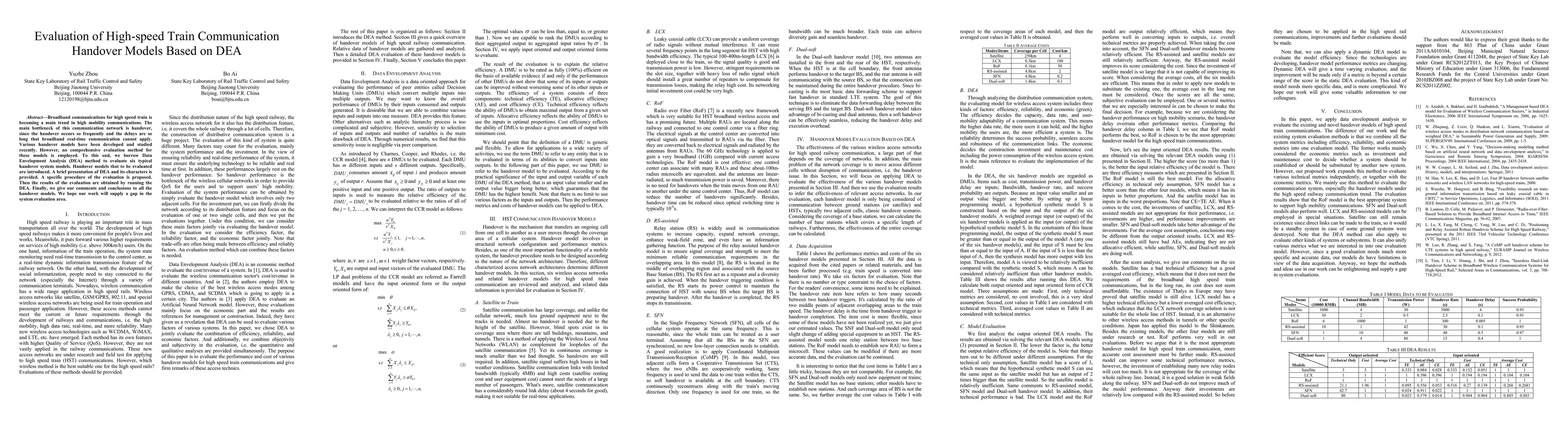 A study evaluates six high-speed train communication handover models using Data Envelopment Analysis (DEA) to assess their effectiveness, providing a comprehensive evaluation method for this field.