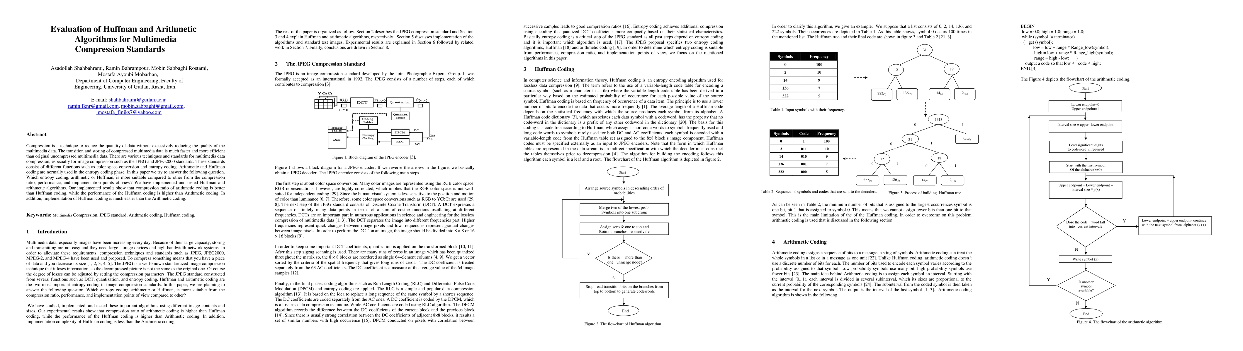 This paper evaluates Huffman and Arithmetic coding algorithms for multimedia compression, finding that Arithmetic coding achieves a better compression ratio but Huffman coding is faster and easier to implement.