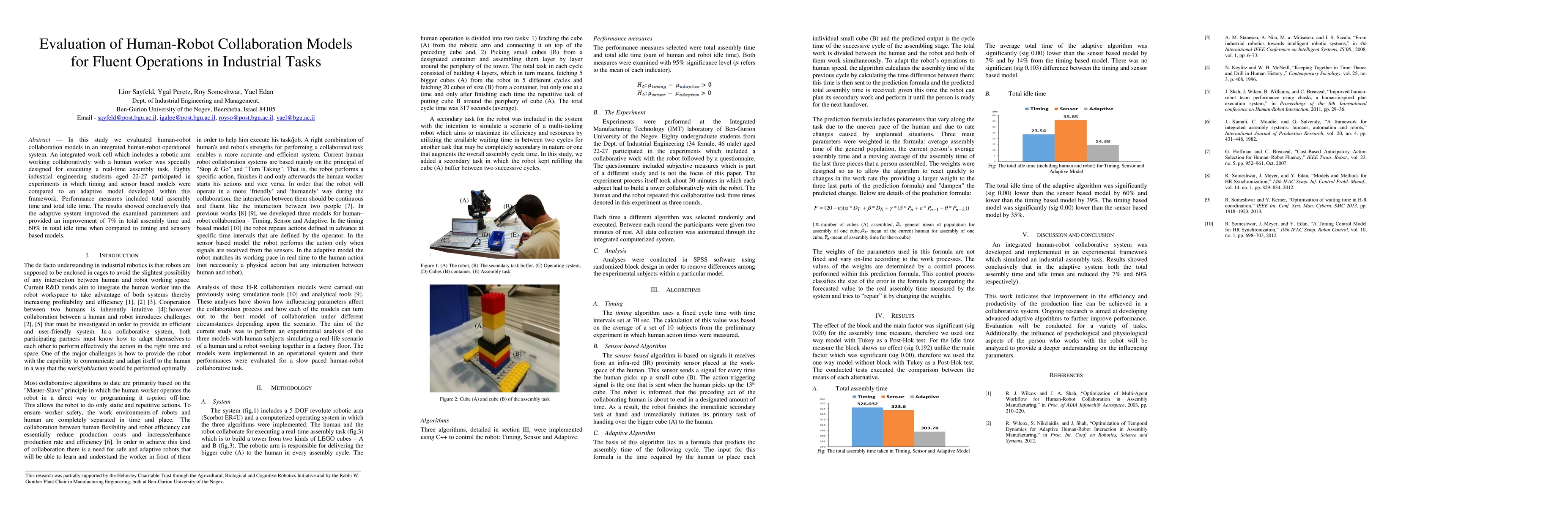 This study evaluated human-robot collaboration models in an integrated work cell for real-time assembly tasks, showing that an adaptive model improved total assembly time by 7% and reduced idle time by 60% compared to timing and sensor-based models.