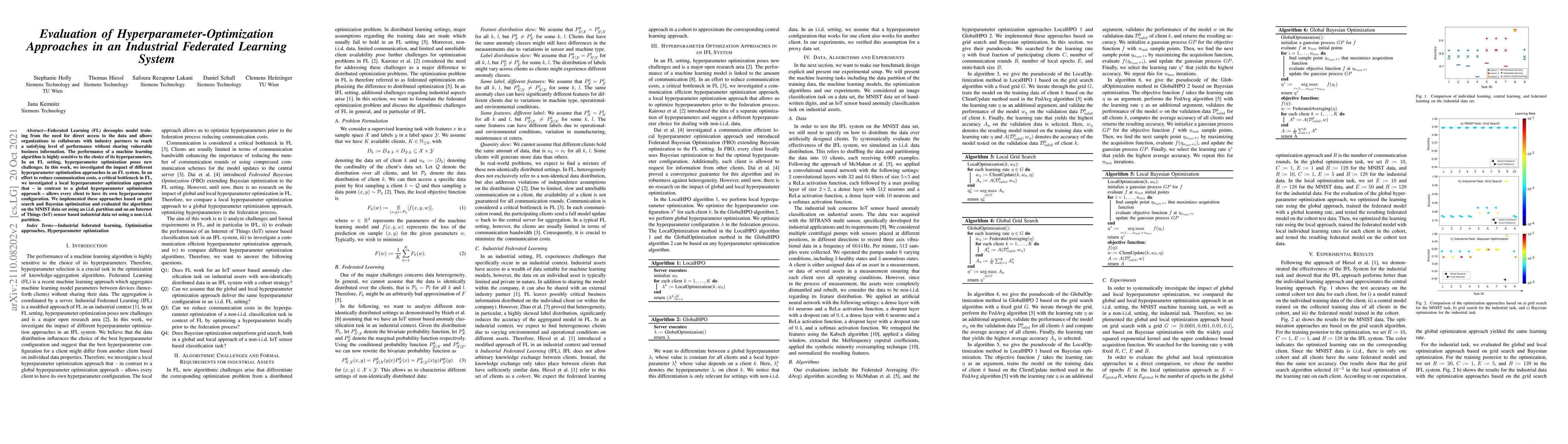 This paper evaluates the effectiveness of different hyperparameter optimization strategies in an industrial Federated Learning system, focusing on local versus global approaches to reduce communication costs. The study compares grid search and Bayesian optimization on both MNIST and IoT sensor data, highlighting the challenges and performance differences in non-i.i.d. data partitions.