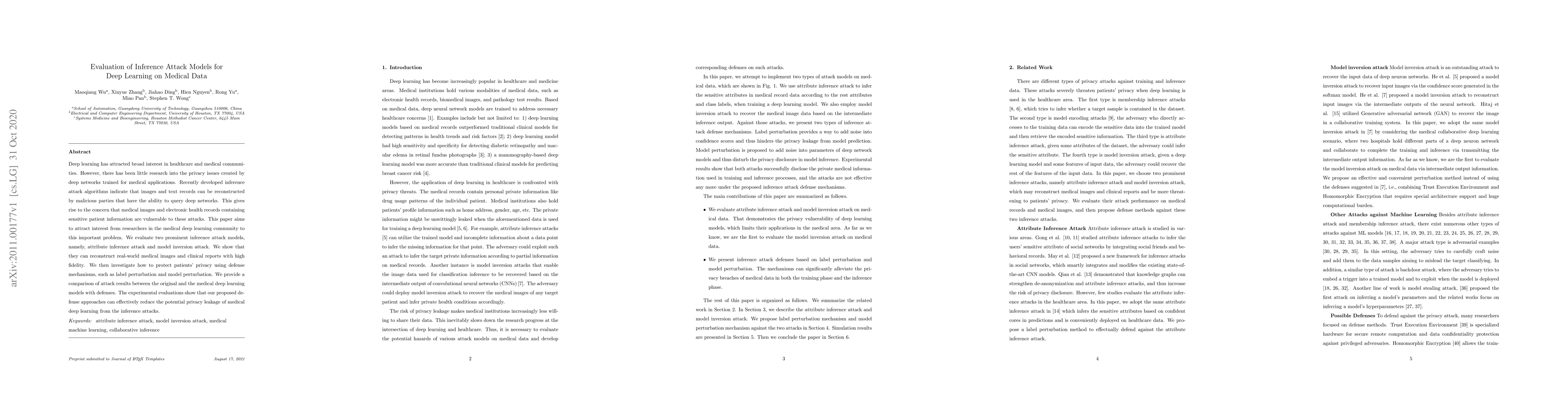 Deep learning has attracted broad interest in healthcare and medical communities. However, there has been little research into the privacy issues created by deep networks trained for medical applications. Recently developed inference attack algorithms indicate that images and text records can be reconstructed by malicious parties that have the ability to query deep networks. This gives rise to the concern that medical images and electronic health records containing sensitive patient information are vulnerable to these attacks. This paper aims to attract interest from researchers in the medical deep learning community to this important problem. We evaluate two prominent inference attack models, namely, attribute inference attack and model inversion attack. We show that they can reconstruct real-world medical images and clinical reports with high fidelity. We then investigate how to protect patients' privacy using defense mechanisms, such as label perturbation and model perturbation. We provide a comparison of attack results between the original and the medical deep learning models with defenses. The experimental evaluations show that our proposed defense approaches can effectively reduce the potential privacy leakage of medical deep learning from the inference attacks.