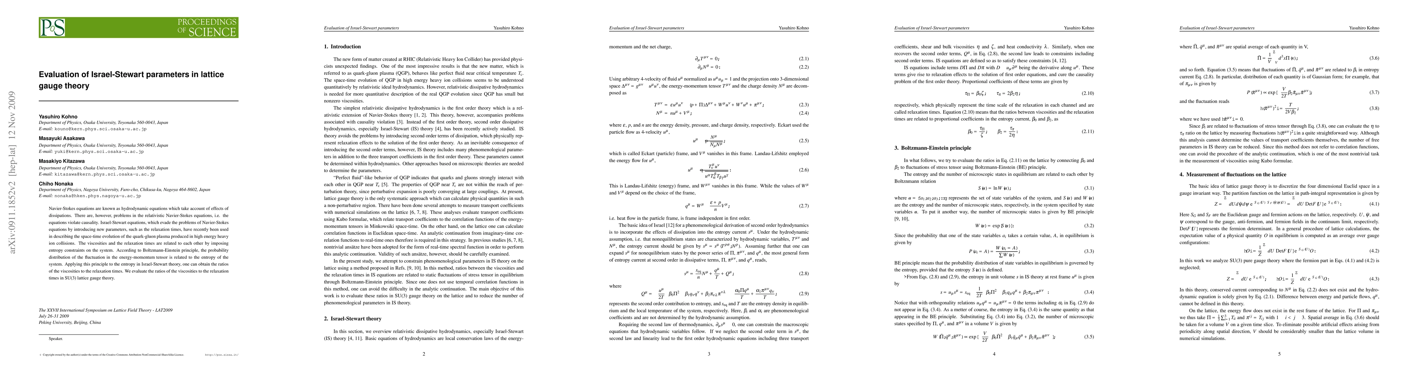 This paper evaluates the Israel-Stewart parameters in lattice gauge theory to address the causality issues in relativistic Navier-Stokes equations. It derives the ratios of viscosities to relaxation times by applying entropy constraints and the Boltzmann-Einstein principle in SU(3) lattice gauge theory.