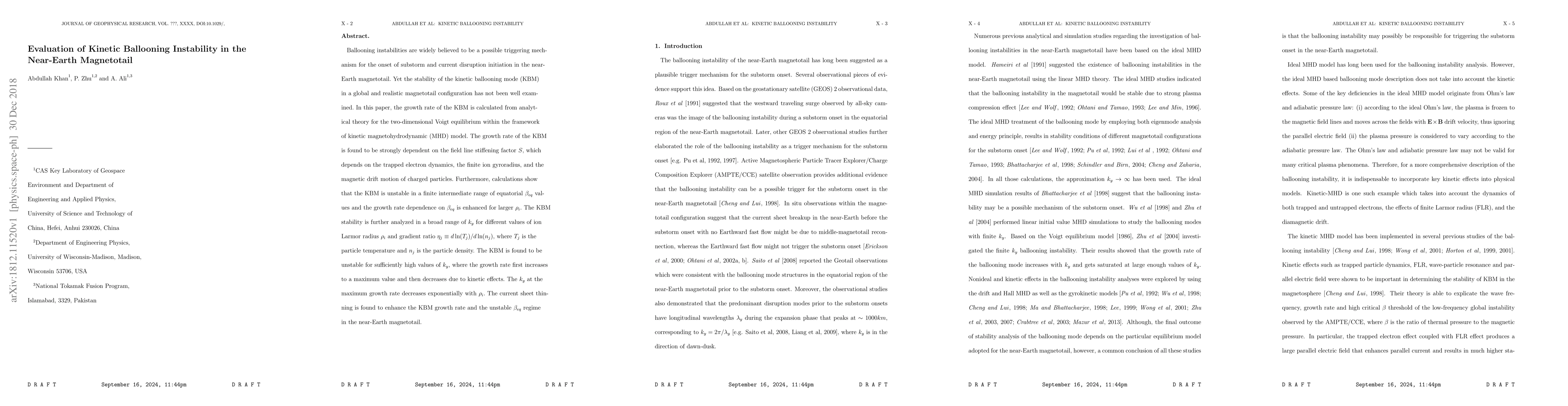 This paper evaluates the kinetic ballooning mode (KBM) instability in the near-Earth magnetotail using a kinetic magnetohydrodynamic model. The growth rate is found to be strongly dependent on the field line stiffening factor and is unstable for certain ranges of $\beta_{eq}$ and $k_y$, with current sheet thinning enhancing the instability.