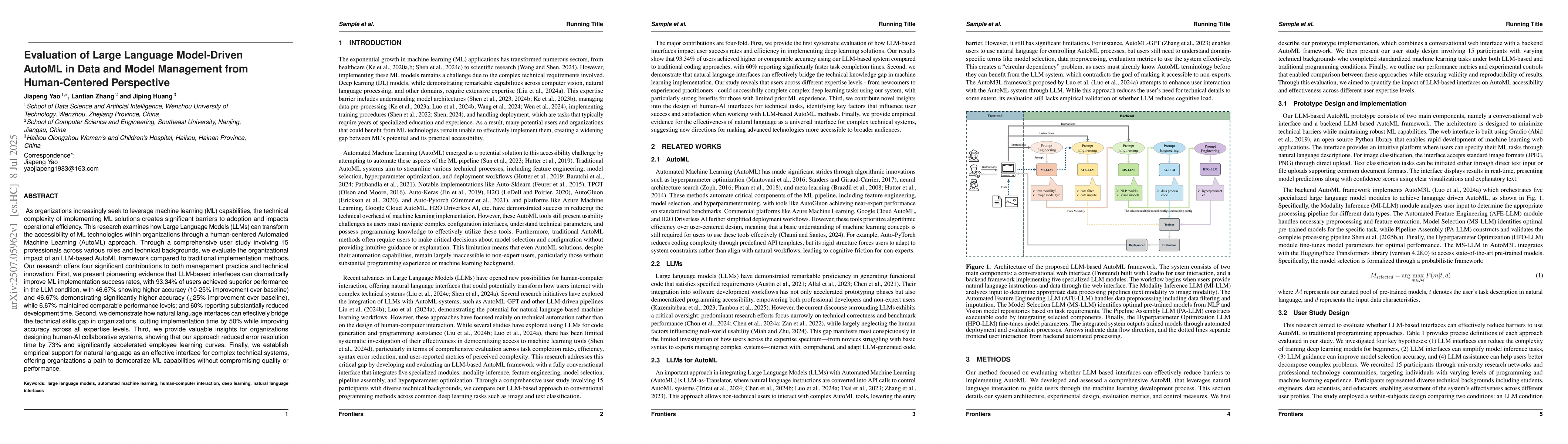 As organizations increasingly seek to leverage machine learning (ML) capabilities, the technical complexity of implementing ML solutions creates significant barriers to adoption and impacts operational efficiency. This research examines how Large Language Models (LLMs) can transform the accessibility of ML technologies within organizations through a human-centered Automated Machine Learning (AutoML) approach. Through a comprehensive user study involving 15 professionals across various roles and technical backgrounds, we evaluate the organizational impact of an LLM-based AutoML framework compared to traditional implementation methods. Our research offers four significant contributions to both management practice and technical innovation: First, we present pioneering evidence that LLM-based interfaces can dramatically improve ML implementation success rates, with 93.34% of users achieved superior performance in the LLM condition, with 46.67% showing higher accuracy (10-25% improvement over baseline) and 46.67% demonstrating significantly higher accuracy (>25% improvement over baseline), while 6.67% maintained comparable performance levels; and 60% reporting substantially reduced development time. Second, we demonstrate how natural language interfaces can effectively bridge the technical skills gap in organizations, cutting implementation time by 50% while improving accuracy across all expertise levels. Third, we provide valuable insights for organizations designing human-AI collaborative systems, showing that our approach reduced error resolution time by 73% and significantly accelerated employee learning curves. Finally, we establish empirical support for natural language as an effective interface for complex technical systems, offering organizations a path to democratize ML capabilities without compromising quality or performance.