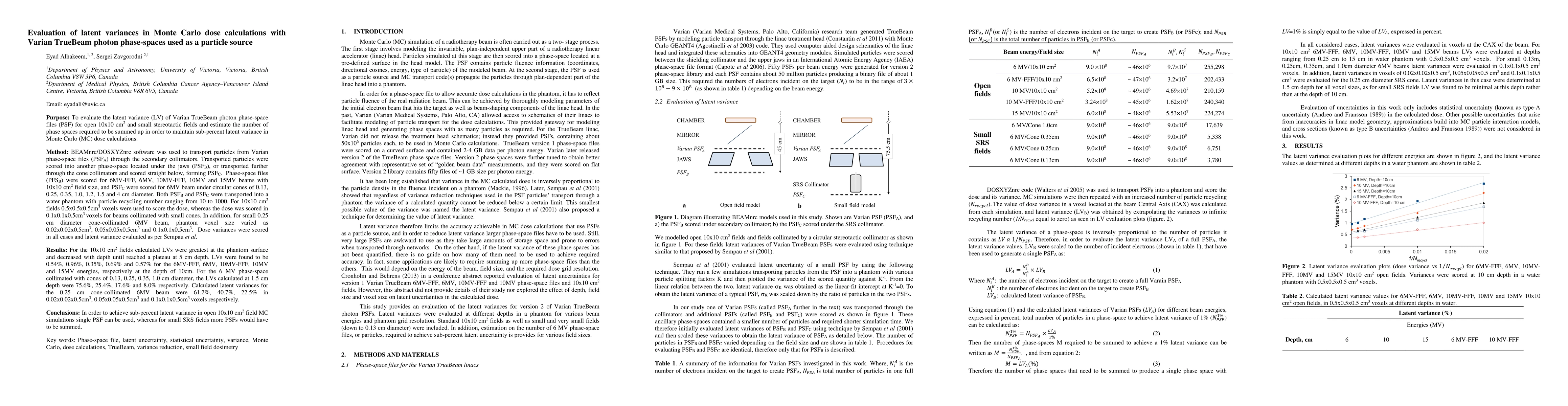 Purpose: To evaluate the latent variance (LV) of TrueBeam photon phase-space files (PSF) for open 10x10$cm^2$ and small fields. Methods: BEAMnrc/DOSXYZnrc was used to transport particles from Varian phase-space files (PSFA) through the secondary collimators. Transported particles were scored into another phase-space located under the jaws (PSFB), or transported further through the cone collimators and scored straight below, forming PSFC. PFSB were scored for 6MV-FFF, 6MV, 10MV-FFF, 10MV and 15MV beams with 10x10$cm^2$ field size, and PSFC were scored for 6MV beam under cones of 0.13, 0.25, 0.35, 1.0, 1.2, 1.5 and 4cm diameter. PSFB and PSFC were transported into a water phantom with particle recycling number ranging from 10 to 1000. For 10x10$cm^2$ fields 0.5x0.5x0.5cm^3 voxels were used to score the dose, whereas the dose was scored in 0.1x0.1x0.5cm^3 voxels for beams collimated with small cones. For small 0.25cm diameter cone-collimated 6MV beam, phantom voxel size varied as 0.02x0.02x0.5cm^3, 0.05x0.05x0.5cm^3 and 0.1x0.1x0.5cm^3. Dose variances were scored in all cases and LV evaluated as per Sempau et al. Results: For the 10x10cm^2 fields calculated LVs were greatest at the phantom surface and decreased with depth until reached a plateau at 5cm depth. LVs were 0.54%, 0.96%, 0.35%, 0.69% and 0.57% for the 6MV-FFF, 6MV, 10MV-FFF, 10MV and 15MV energies, respectively at 10cm depth. For the 6 MV phase-space collimated with cones of 0.13, 0.25, 0.35, 1.0cm diameter, the LVs calculated at 1.5cm depth were 75.6%, 25.4%, 17.6% and 8.0% respectively. Calculated LV for the 0.25cm cone-collimated 6MV beam were 61.2%, 40.7%, 22.5% in 0.02x0.02x0.5cm^3, 0.05x0.05x0.5cm^3 and 0.1x0.1x0.5cm^3 voxels respectively. Conclusion: Single PSF can be used to achieve sub-percent latent variance in open 10x10cm^2 field MC simulations, whereas more PSFs would have to be summed for small SRS fields.