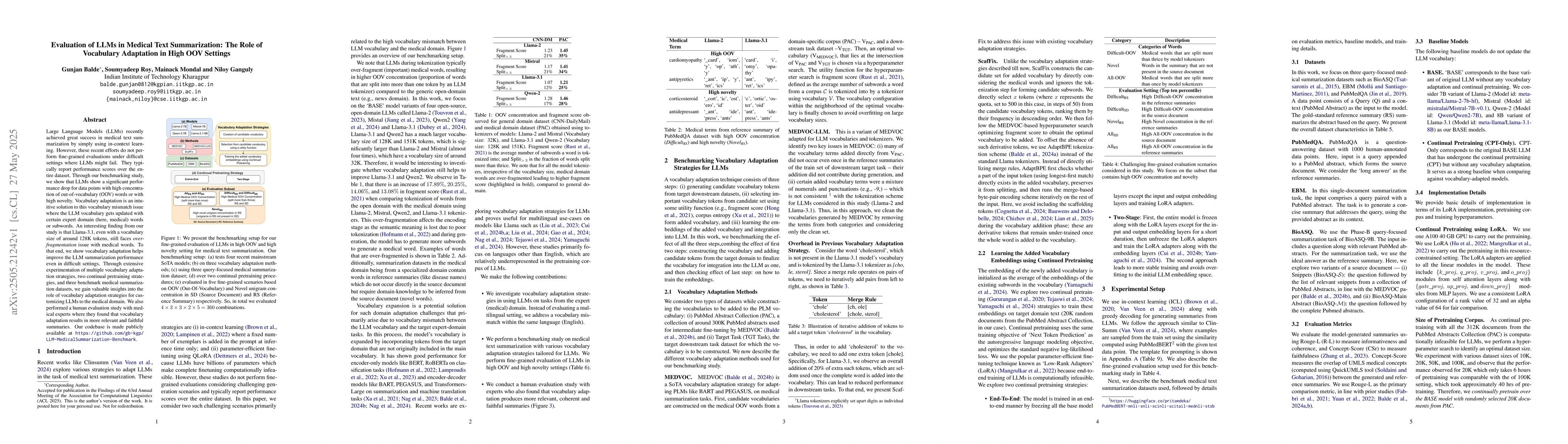 The research evaluates Large Language Models (LLMs) in medical text summarization, finding significant performance drops in high OOV (out-of-vocabulary) word contexts. Vocabulary adaptation, updating LLM vocabularies with domain-specific words, is proposed as a solution to improve performance in challenging medical summarization settings. Experiments reveal that even Llama-3.1, with a 128K token vocabulary, faces fragmentation with medical terms. Human experts confirm that vocabulary adaptation yields more relevant and faithful summaries. The study's insights and methodologies are shared via a public codebase.