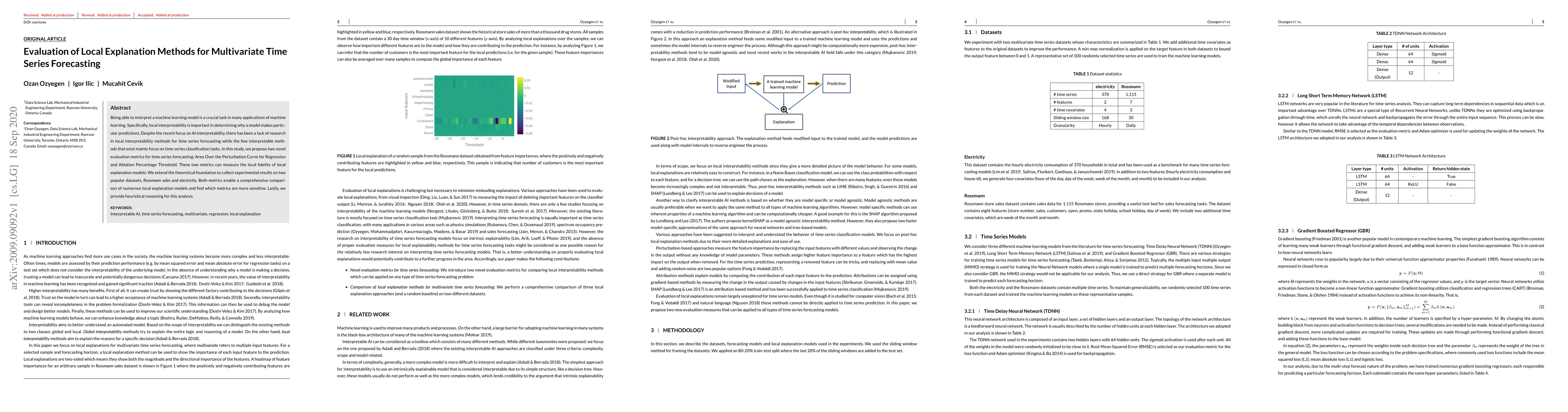 This paper proposes two new evaluation metrics—Area Over the Perturbation Curve for Regression and Ablation Percentage Threshold—to assess the local interpretability of time series forecasting models. The study applies these metrics to compare various local explanation models on two datasets, revealing insights into their sensitivity and effectiveness.