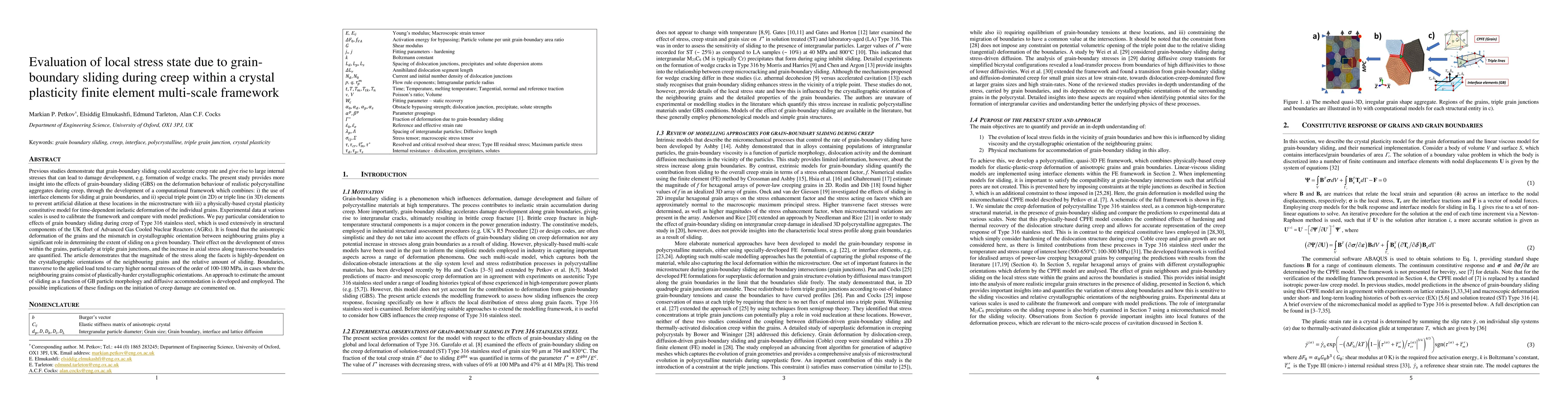 Previous studies demonstrate that grain-boundary sliding could accelerate creep rate and give rise to large internal stresses that can lead to damage development, e.g. formation of wedge cracks. The present study provides more insight into the effects of grain-boundary sliding (GBS) on the deformation behaviour of realistic polycrystalline aggregates during creep, through the development of a computational framework which combines: i) the use of interface elements for sliding at grain boundaries, and ii) special triple point (in 2D) or triple line (in 3D) elements to prevent artificial dilation at these locations in the microstructure with iii) a physically-based crystal plasticity constitutive model for time-dependent inelastic deformation of the individual grains. Experimental data at various scales is used to calibrate the framework and compare with model predictions. We pay particular consideration to effects of grain boundary sliding during creep of Type 316 stainless steel, which is used extensively in structural components of the UK fleet of Advanced Gas Cooled Nuclear Reactors (AGRs). It is found that the anisotropic deformation of the grains and the mismatch in crystallographic orientation between neighbouring grains play a significant role in determining the extent of sliding on a given boundary. Their effect on the development of stress within the grains, particularly at triple grain junctions, and the increase in axial stress along transverse boundaries are quantified. The article demonstrates that the magnitude of the stress along the facets is highly-dependent on the crystallographic orientations of the neighbouring grains and the relative amount of sliding. Boundaries, transverse to the applied load tend to carry higher normal stresses of the order of 100-180 MPa, in cases where the neighbouring grains consist of plastically-harder crystallographic orientations.