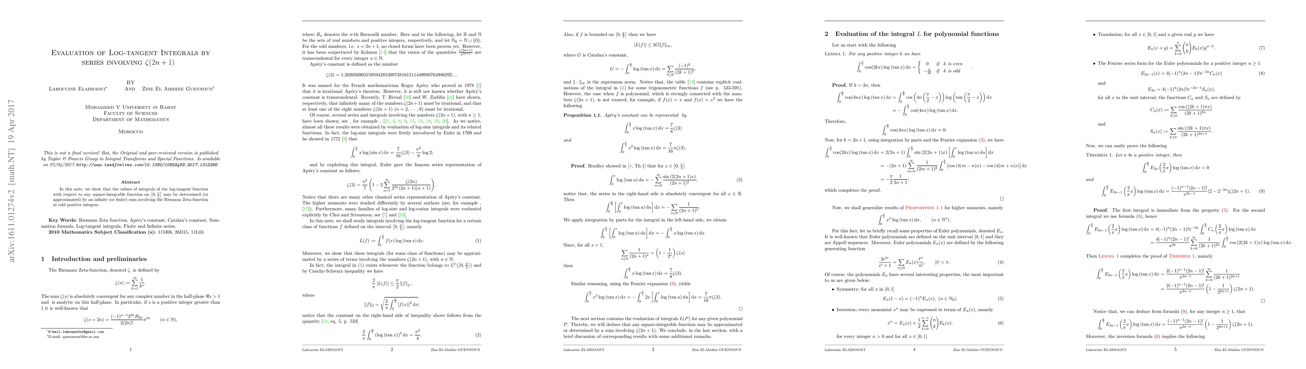 In this note, we show that the values of integrals of the log-tangent function with respect to any square-integrable function on $\left[0 , \frac{\pi}{2} \right]$ may be determined by a finite or infinite sum involving the Riemann Zeta-function at odd positive integers.