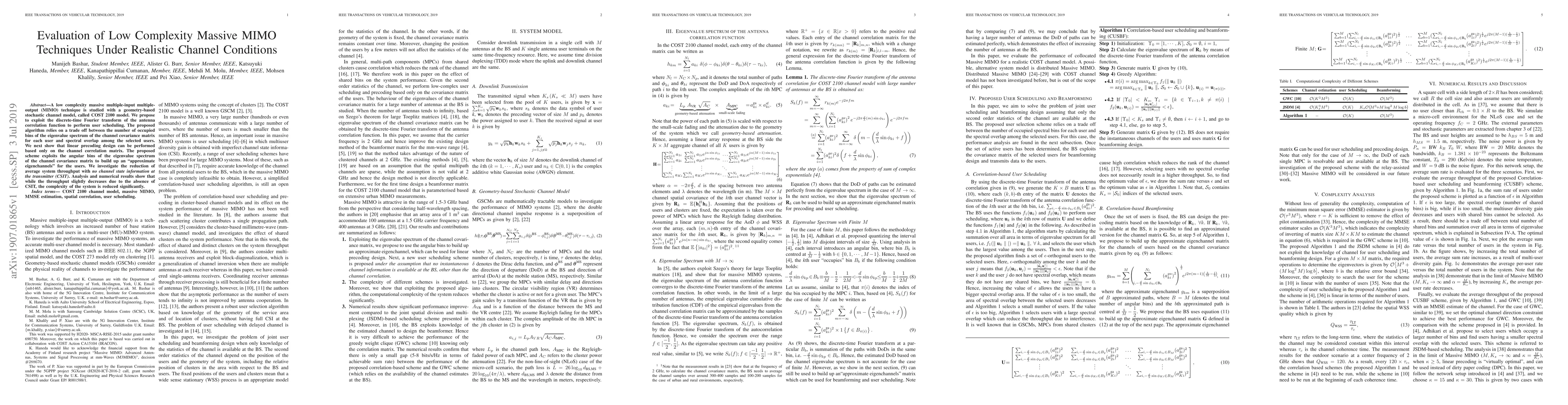 This paper evaluates a low complexity massive MIMO technique using a geometry-based stochastic channel model. It proposes a user scheduling algorithm based on the discrete-time Fourier transform of the antenna correlation function, achieving reduced complexity and slightly lower throughput without channel state information at the transmitter.