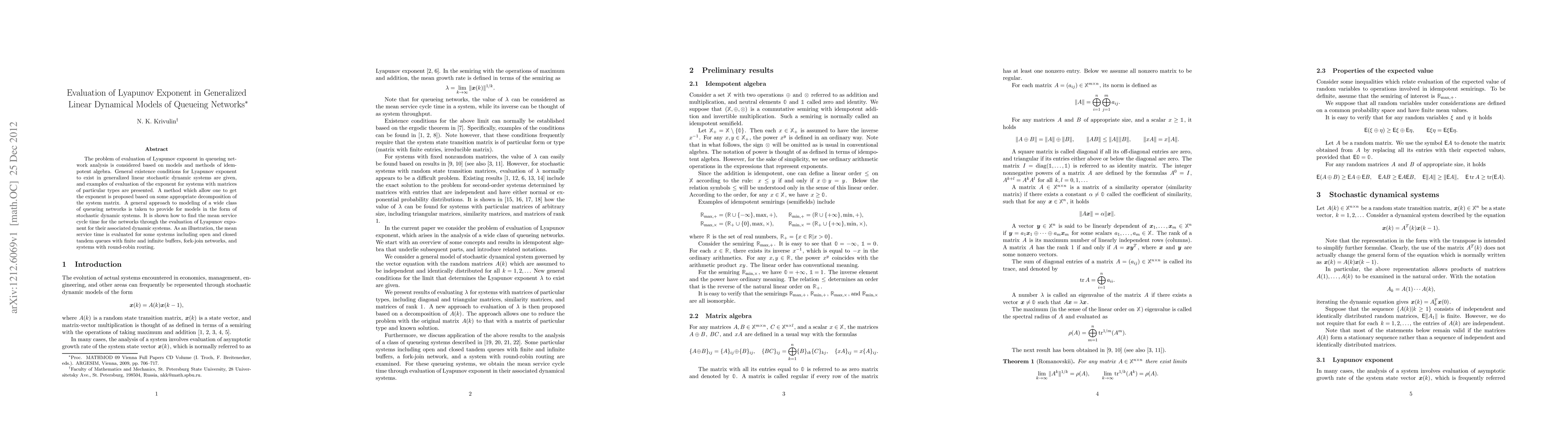 This paper evaluates the Lyapunov exponent in generalized linear dynamical models of queueing networks using idempotent algebra. It proposes a method for finding the exponent through system matrix decomposition and demonstrates its application to various queueing network models to determine mean service cycle times.