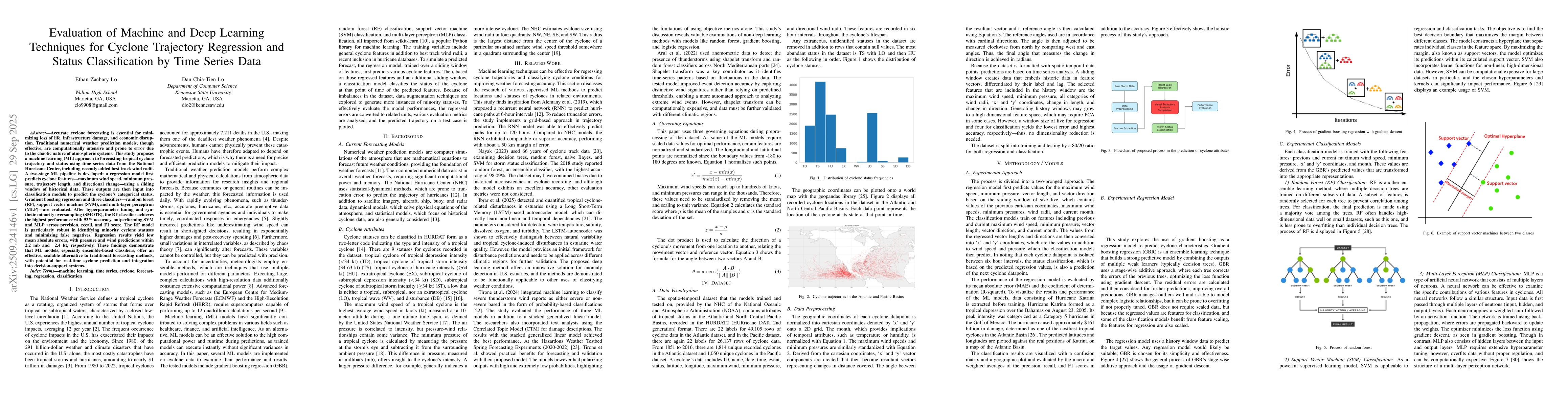 Development of a two-stage ML pipeline combining gradient boosting regression with ensemble classifiers, along with SMOTE for handling class imbalance in cyclone status classification.