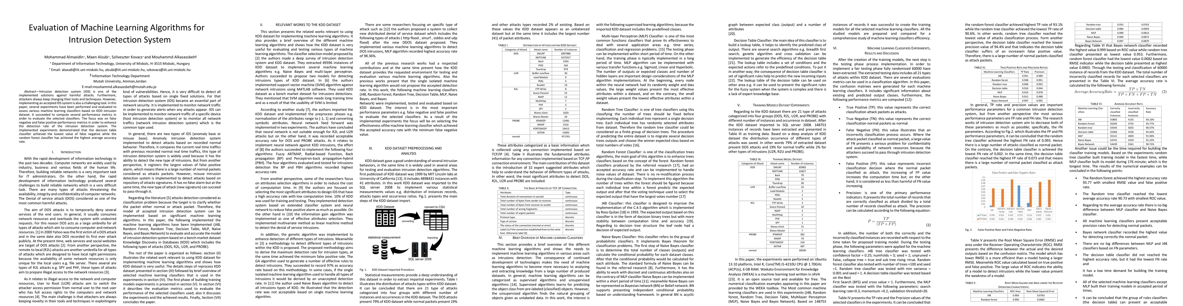 This paper evaluates various machine learning algorithms for intrusion detection systems using the KDD dataset, focusing on false negative and positive rates. Experiments show that the decision table classifier minimizes false negatives, while the random forest classifier achieves the highest accuracy.