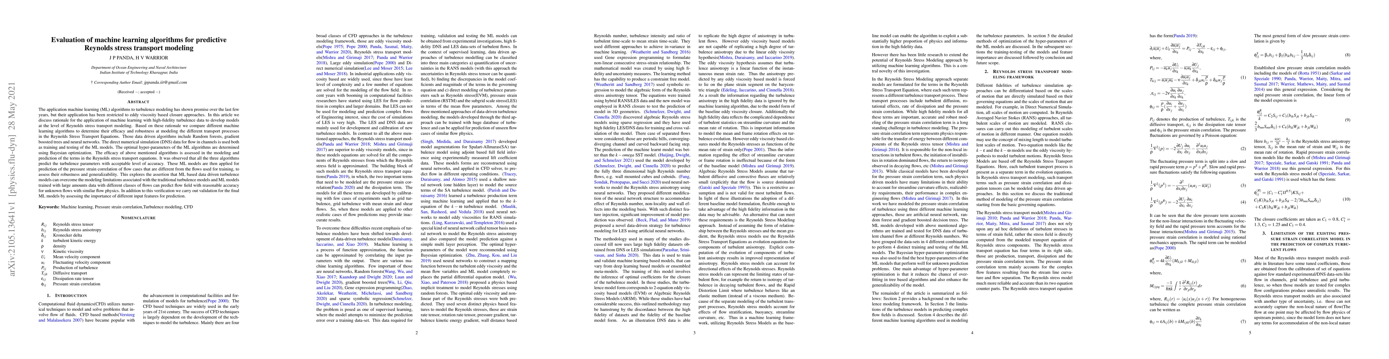 This paper evaluates machine learning algorithms—Random forests, gradient boosted trees, and neural networks—for modeling Reynolds stress transport in turbulence. Using high-fidelity DNS data, the study finds these algorithms can predict turbulence parameters with acceptable accuracy, demonstrating the potential of data-driven models to overcome traditional turbulence modeling limitations.