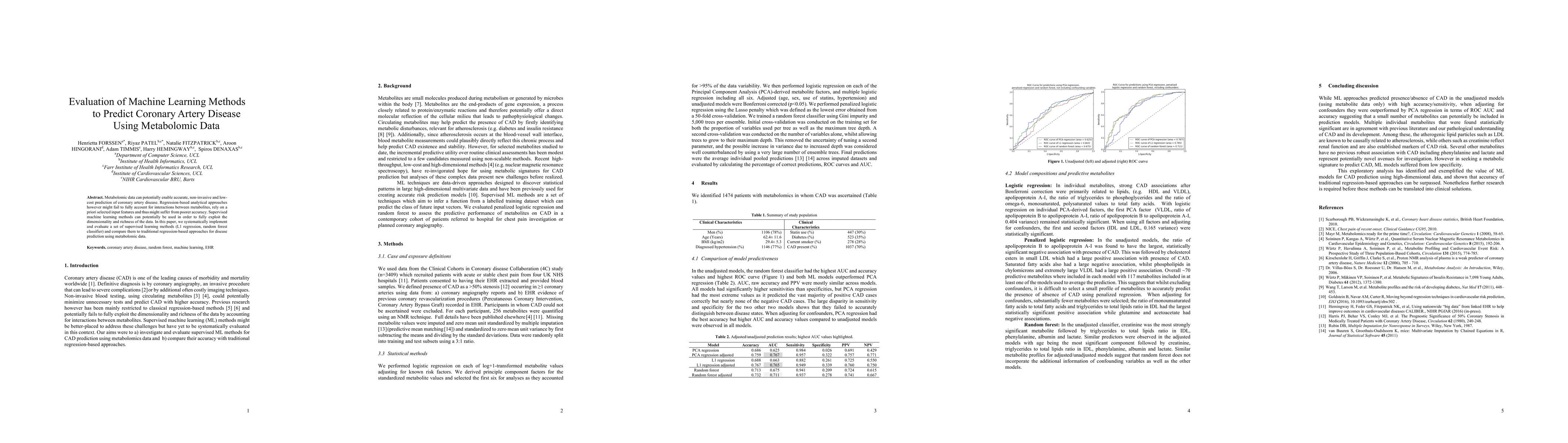 Metabolomic data can potentially enable accurate, non-invasive and low-cost prediction of coronary artery disease. Regression-based analytical approaches however might fail to fully account for interactions between metabolites, rely on a priori selected input features and thus might suffer from poorer accuracy. Supervised machine learning methods can potentially be used in order to fully exploit the dimensionality and richness of the data. In this paper, we systematically implement and evaluate a set of supervised learning methods (L1 regression, random forest classifier) and compare them to traditional regression-based approaches for disease prediction using metabolomic data.