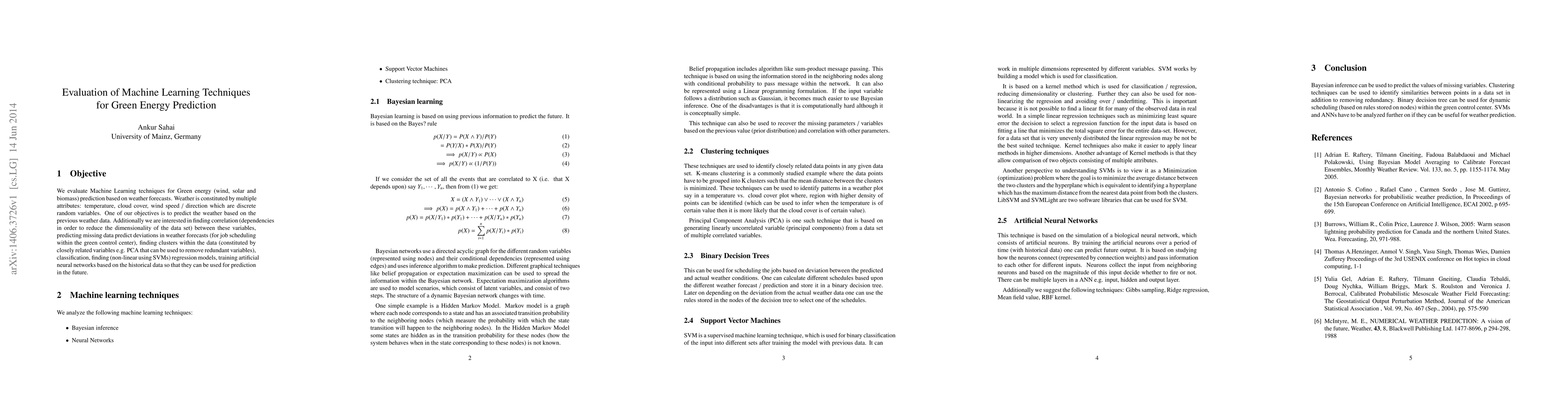 This study evaluates various Machine Learning techniques—Bayesian Inference, Neural Networks, Support Vector Machines, and Clustering (PCA)—for predicting green energy (wind, solar) using historical and forecasted weather data. The goal is to forecast green energy, identify deviations, correlate weather parameters with energy availability, and recover missing data.