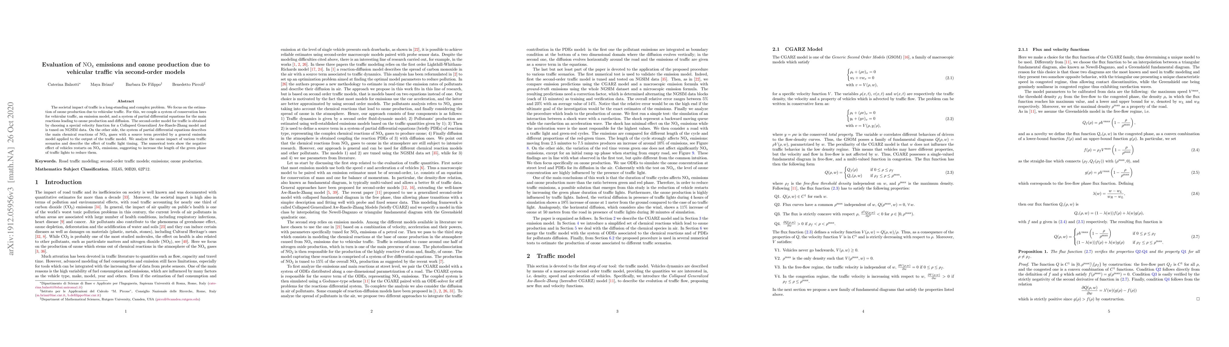 The societal impact of traffic is a long-standing and complex problem. We focus on the estimation of ozone production due to vehicular traffic. For this, we couple a system of conservation laws for vehicular traffic, an emission model, and a system of partial differential equations for the main reactions leading to ozone production and diffusion. The second-order model for traffic is obtained by choosing a special velocity function for a Collapsed Generalized Aw-Rascle-Zhang model and is tuned on NGSIM data. On the other side, the system of partial differential equations describes the main chemical reactions of $\mathrm{NO_x}$ gases with a source term provided by a general emission model applied to the output of the traffic model. We analyze the ozone impact of various traffic scenarios and describe the effect of traffic light timing. The numerical tests show the negative effect of vehicles restarts on $\mathrm{NO_x}$ emissions, suggesting to increase the length of the green phase of traffic lights to reduce them.