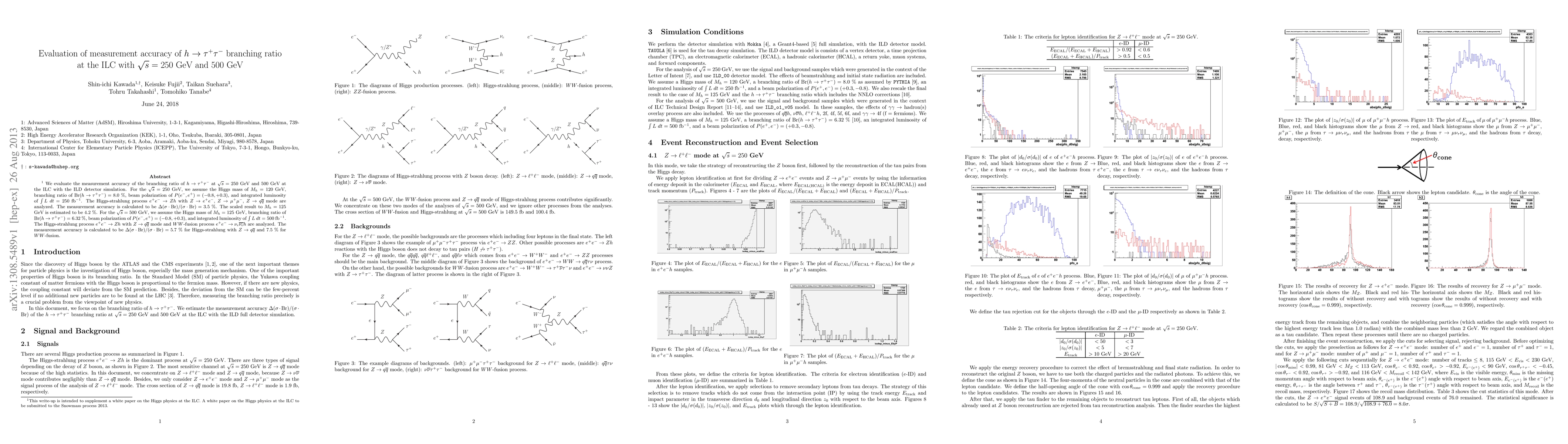 This paper evaluates the measurement accuracy of the $h \to \tau^+ \tau^-$ branching ratio at the ILC for $\sqrt{s} = 250$ and 500 GeV, finding accuracies of 3.5% and 5.7% to 7.5%, respectively, using ILD detector simulations and various production processes.
