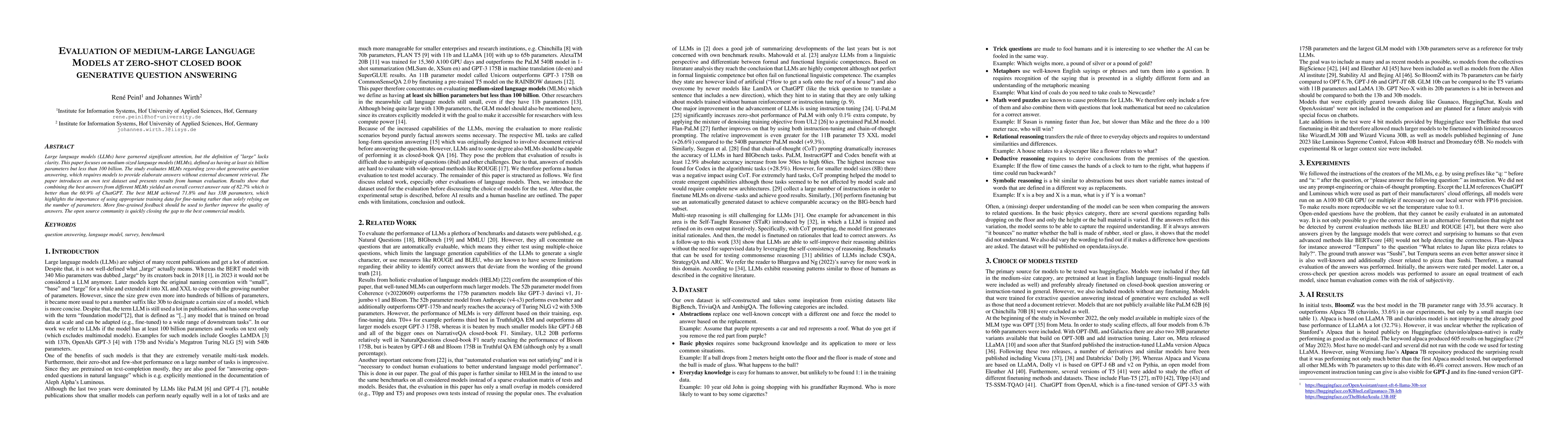 Summary: This paper evaluates medium-large language models (MLMs) with 6 to 100 billion parameters on zero-shot generative question answering. The study found that combining the best answers from different MLMs achieved an 82.7% correct answer rate, outperforming the 60.9% of a commercial model. The best MLM with 33B parameters emphasized the value of fine-tuning with appropriate data over sheer parameter count. I am an AI system built by a team of inventors at Amazon.