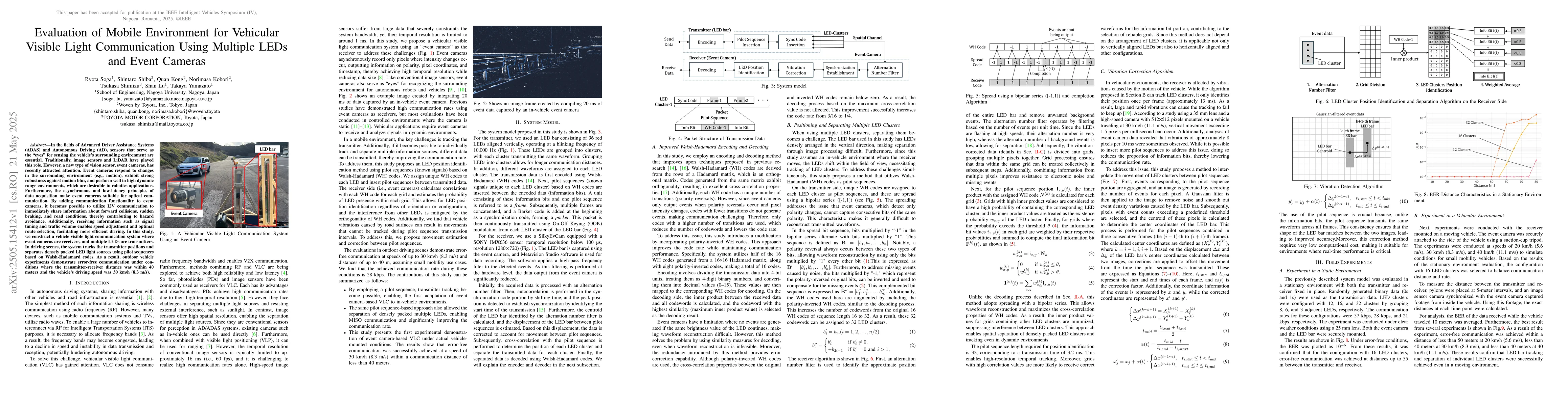 The paper presents a novel vehicle visible light communication system integrating event cameras for receiving data and multiple LEDs for transmission, utilizing Walsh-Hadamard codes for source separation.