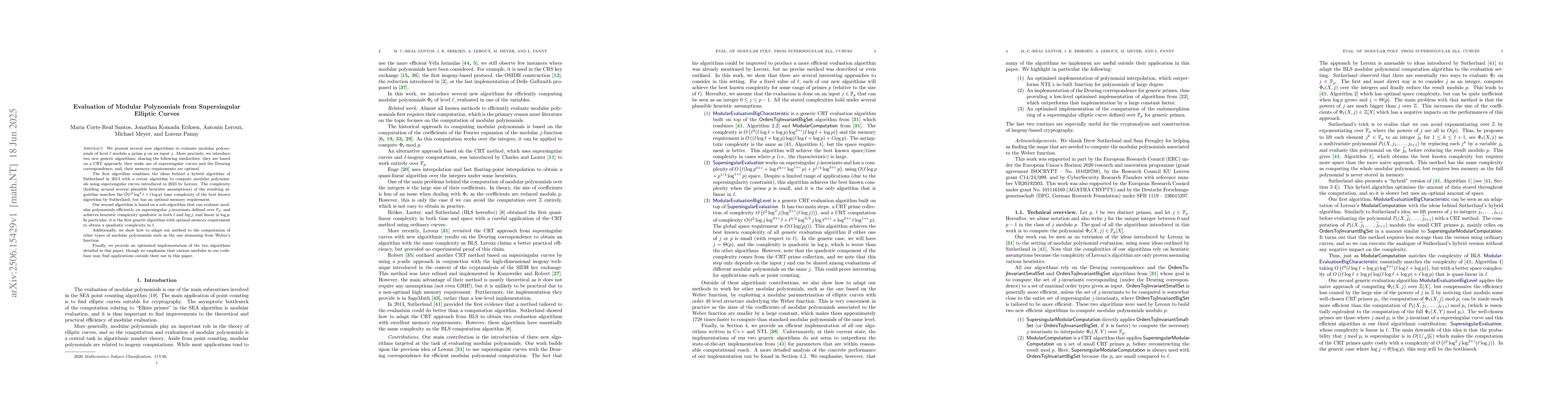 This paper introduces two new algorithms for evaluating modular polynomials of level $ell$ modulo a prime $p$, utilizing supersingular elliptic curves and the Deuring correspondence. The first algorithm combines previous methods, matching the best known complexity with optimal memory. The second algorithm achieves quadratic complexity in $ell$ and $log j$, linear in $log p$, with optimal memory. Both algorithms can be adapted for other modular polynomial computations, and the authors provide an optimized code implementation.