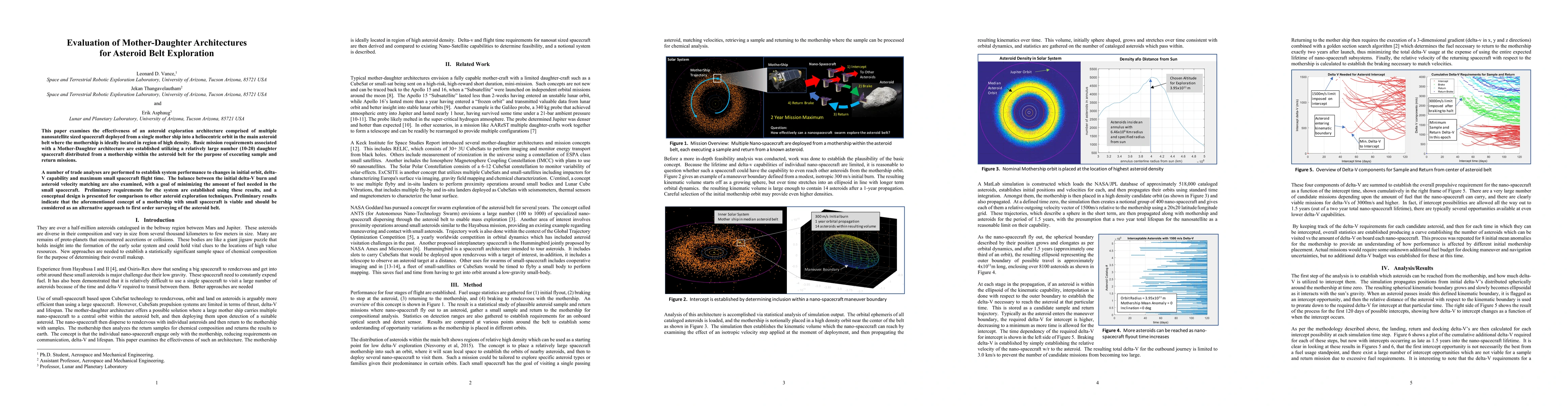 This paper examines the effectiveness of an asteroid exploration architecture comprised of multiple nanosatellite sized spacecraft deployed from a single mother ship into a heliocentric orbit in the main asteroid belt where the mothership is ideally located in region of high density. Basic mission requirements associated with a Mother-Daughter architecture are established utilizing a relatively large number (10-20) daughter spacecraft distributed from a mothership within the asteroid belt for the purpose of executing sample and return missions. A number of trade analyses are performed to establish system performance to changes in initial orbit, delta-V capability and maximum small spacecraft flight time. The balance between the initial delta-V burn and asteroid velocity matching are also examined, with a goal of minimizing the amount of fuel needed in the small spacecraft. Preliminary requirements for the system are established using these results, and a conceptual design is presented for comparison to other asteroid exploration techniques. Preliminary results indicate that the aforementioned concept of a mothership with small spacecraft is viable and should be considered as an alternative approach to first order surveying of the asteroid belt.