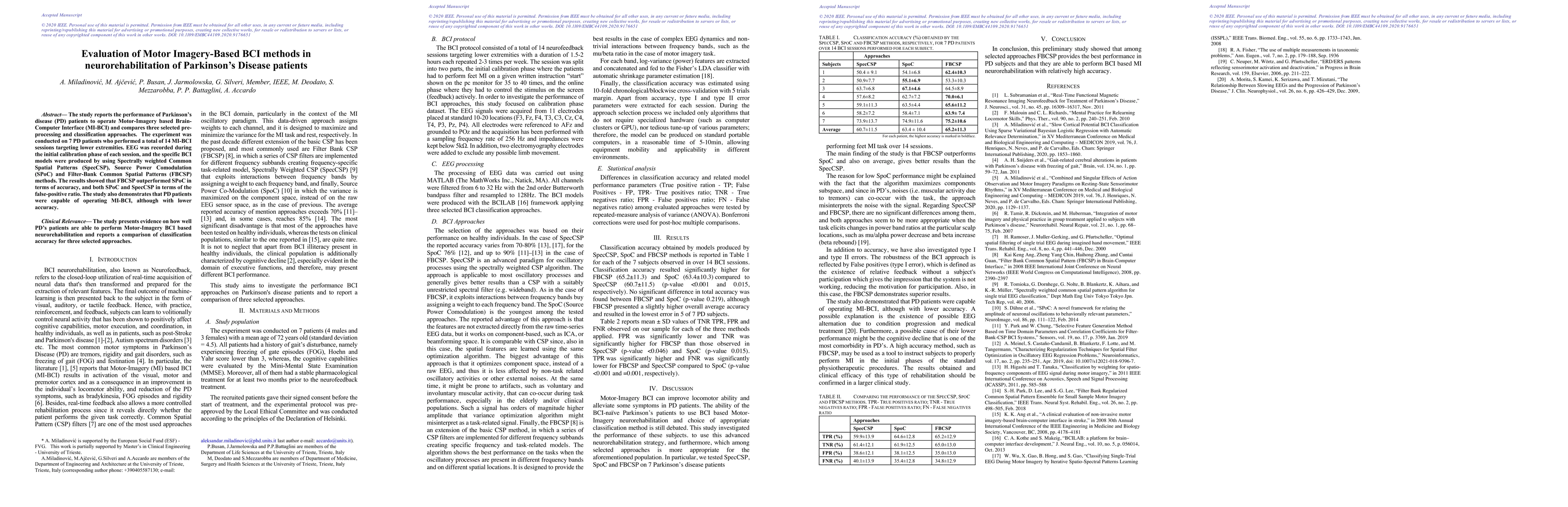 This study evaluates the efficacy of Motor-Imagery based Brain-Computer Interface (MI-BCI) methods in neurorehabilitation for Parkinson's Disease patients, finding that the Filter-Bank Common Spatial Patterns (FBCSP) method outperformed others in accuracy. Despite lower overall accuracy, PD patients demonstrated the ability to operate MI-BCI systems.