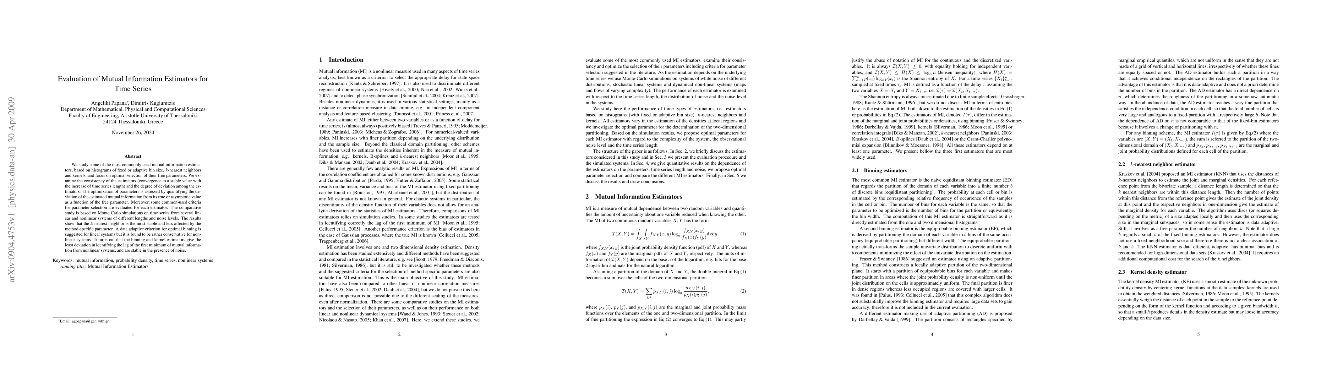 This paper evaluates various mutual information estimators for time series, comparing their consistency and parameter optimization through Monte Carlo simulations. The k-nearest neighbor estimator is found to be the most stable, while adaptive binning shows promise for linear systems but is less effective for nonlinear ones.