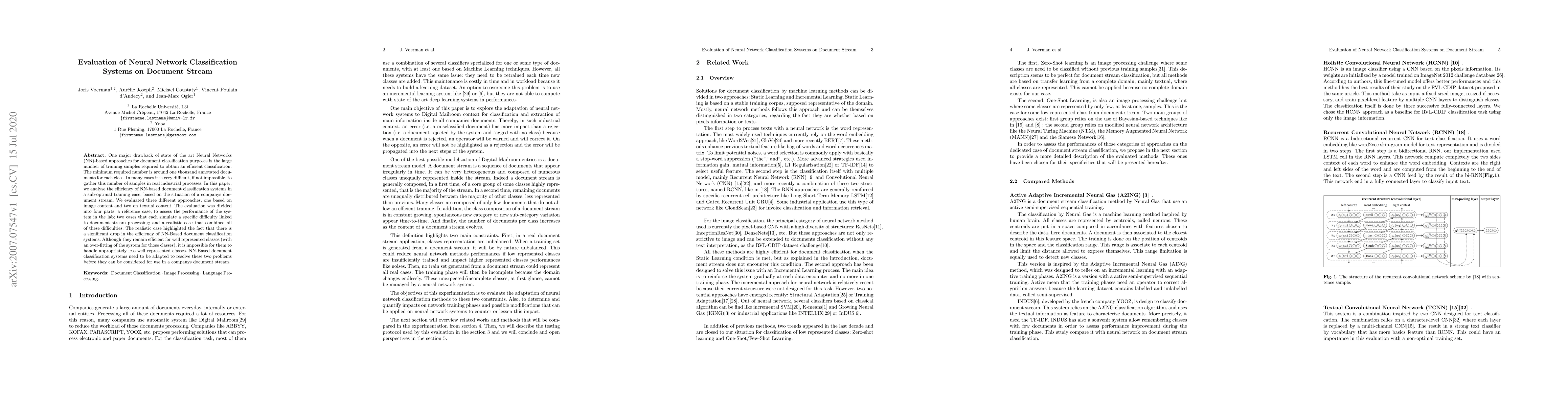 One major drawback of state of the art Neural Networks (NN)-based approaches for document classification purposes is the large number of training samples required to obtain an efficient classification. The minimum required number is around one thousand annotated documents for each class. In many cases it is very difficult, if not impossible, to gather this number of samples in real industrial processes. In this paper, we analyse the efficiency of NN-based document classification systems in a sub-optimal training case, based on the situation of a company document stream. We evaluated three different approaches, one based on image content and two on textual content. The evaluation was divided into four parts: a reference case, to assess the performance of the system in the lab; two cases that each simulate a specific difficulty linked to document stream processing; and a realistic case that combined all of these difficulties. The realistic case highlighted the fact that there is a significant drop in the efficiency of NN-Based document classification systems. Although they remain efficient for well represented classes (with an over-fitting of the system for those classes), it is impossible for them to handle appropriately less well represented classes. NN-Based document classification systems need to be adapted to resolve these two problems before they can be considered for use in a company document stream.