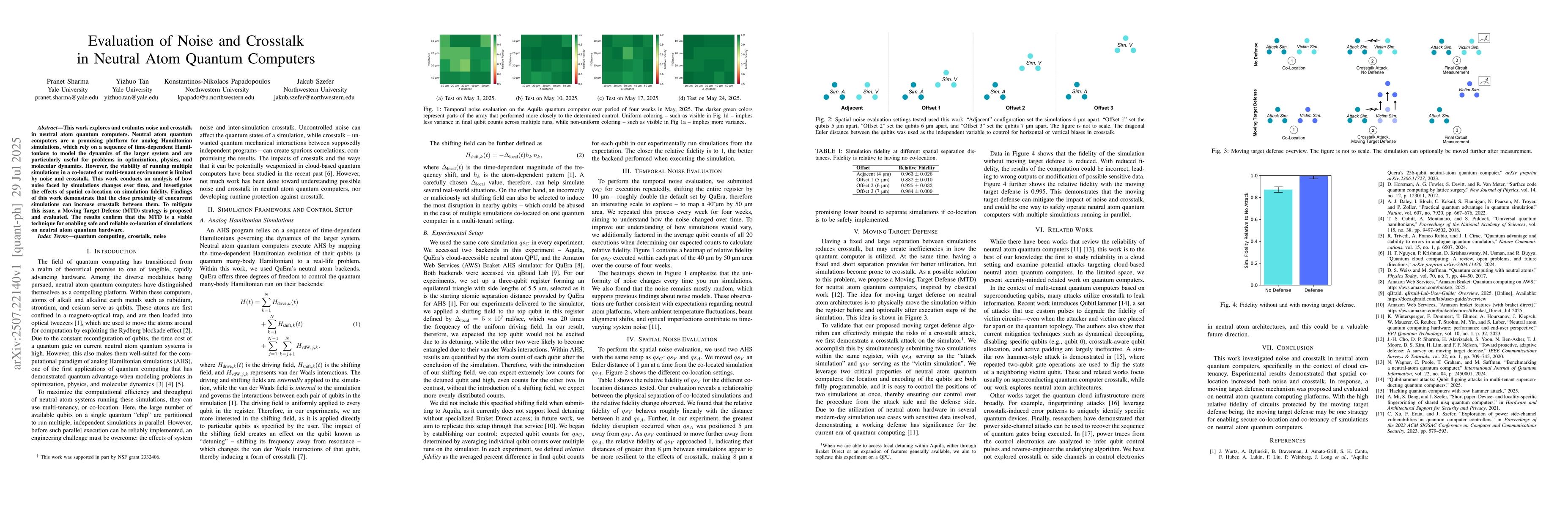 This work explores and evaluates noise and crosstalk in neutral atom quantum computers. Neutral atom quantum computers are a promising platform for analog Hamiltonian simulations, which rely on a sequence of time-dependent Hamiltonians to model the dynamics of the larger system and are particularly useful for problems in optimization, physics, and molecular dynamics. However, the viability of running multiple simulations in a co-located or multi-tenant environment is limited by noise and crosstalk. This work conducts an analysis of how noise faced by simulations changes over time, and investigates the effects of spatial co-location on simulation fidelity. Findings of this work demonstrate that the close proximity of concurrent simulations can increase crosstalk between them. To mitigate this issue, a Moving Target Defense (MTD) strategy is proposed and evaluated. The results confirm that the MTD is a viable technique for enabling safe and reliable co-location of simulations on neutral atom quantum hardware.