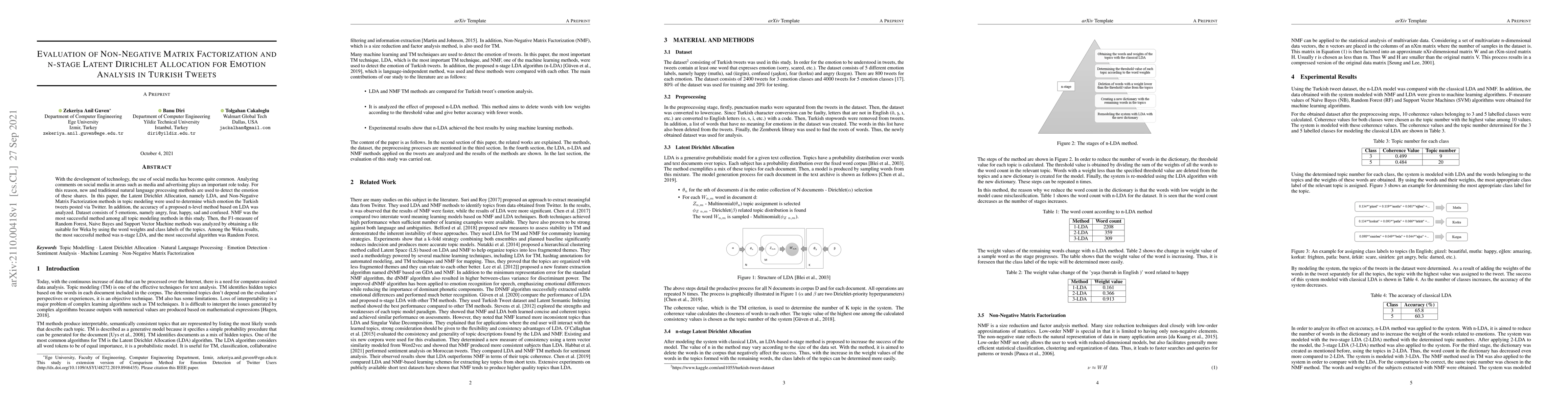 This paper evaluates Non-Negative Matrix Factorization (NMF) and n-stage Latent Dirichlet Allocation (LDA) for emotion analysis in Turkish tweets, finding NMF most effective for topic modeling. The study also analyzes the accuracy of n-level LDA, concluding that n-stage LDA combined with Random Forest yields the best performance.