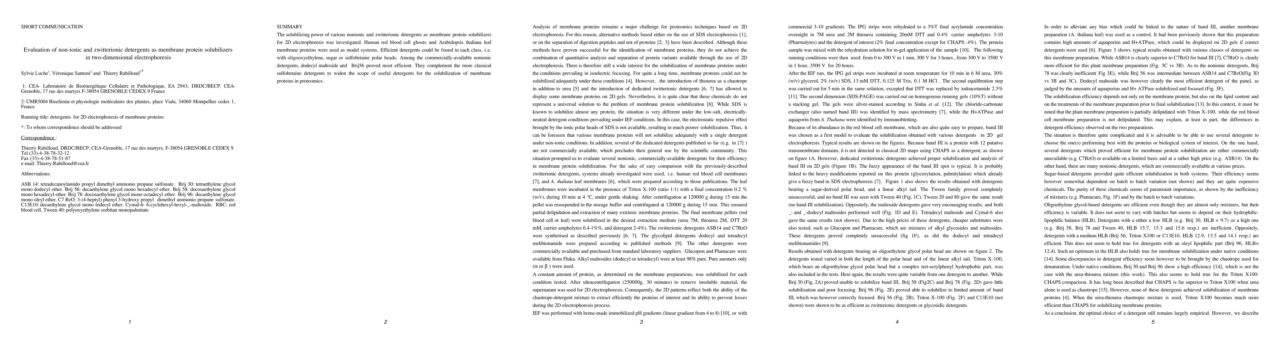 The solubilizing power of various nonionic and zwitterionic detergents as membrane protein solubilizers for two-dimensional electrophoresis was investigated. Human red blood cell ghosts and Arabidopsis thaliana leaf membrane proteins were used as model systems. Efficient detergents could be found in each class, i.e. with oligooxyethylene, sugar or sulfobetaine polar heads. Among the commercially available nonionic detergents, dodecyl maltoside and decaethylene glycol mono hexadecyl ether proved most efficient. They complement the more classical sulfobetaine detergents to widen the scope of useful detergents for the solubilization of membrane proteins in proteomics.