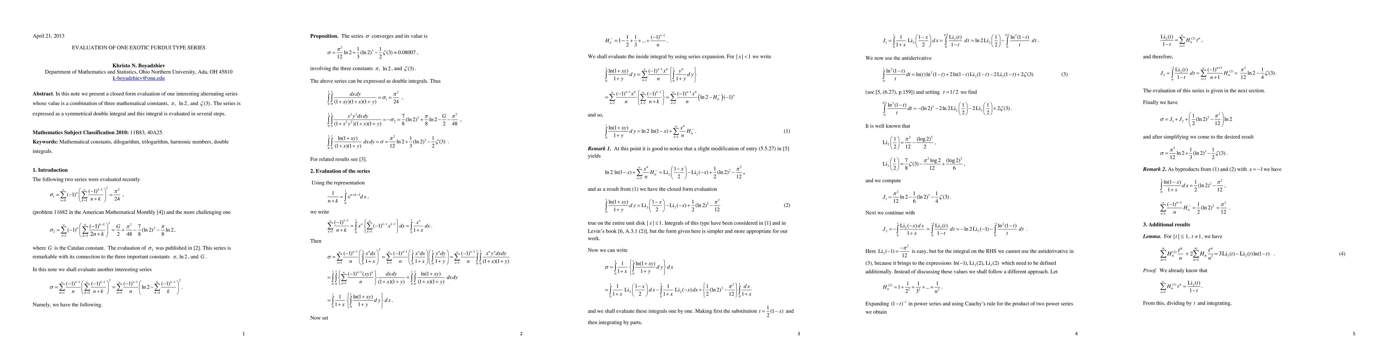 This is a closed form evaluation of one interesting alternating series whose value is a combination of three mathematical constants, Pi, log 2, and Zeta (3).