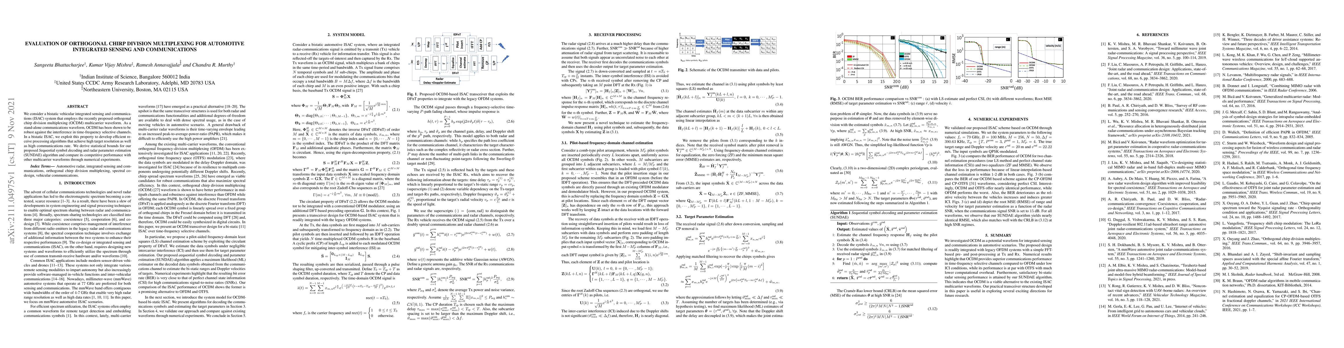 This paper evaluates orthogonal chirp division multiplexing (OCDM) for integrated sensing and communications in bistatic vehicular systems, demonstrating robust performance against interference. The proposed SUNDAE algorithm achieves high target resolution and communication rates, with statistical bounds derived and competitive performance shown through numerical experiments.