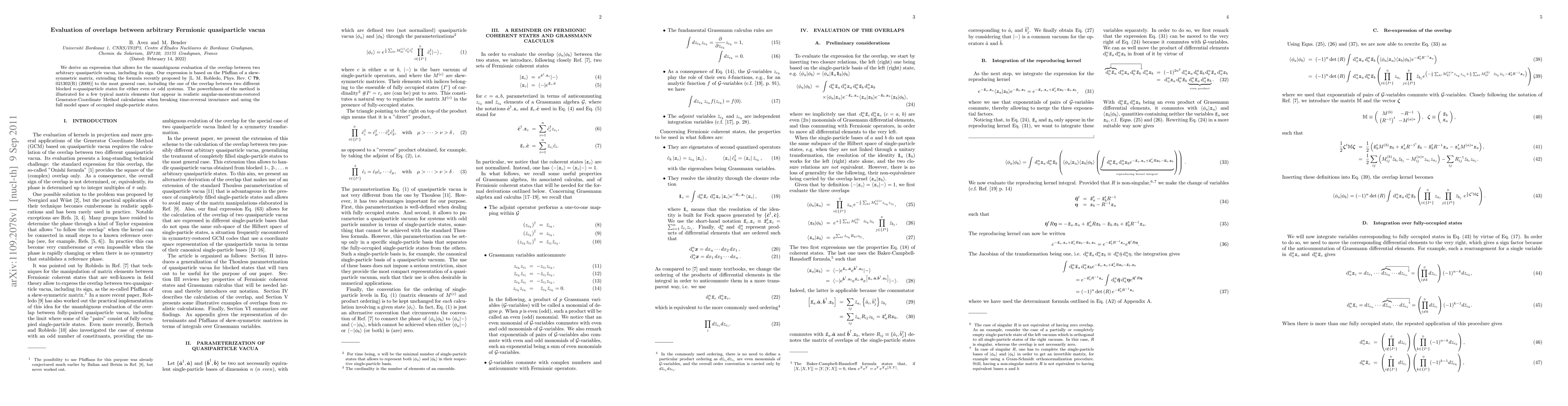 We derive an expression that allows for the unambiguous evaluation of the overlap between two arbitrary quasiparticle vacua, including its sign. Our expression is based on the Pfaffian of a skew-symmetric matrix, extending the formula recently proposed by [L. M. Robledo, Phys. Rev. C 79, 021302(R) (2009)] to the most general case, including the one of the overlap between two different blocked n-quasiparticle states for either even or odd systems. The powerfulness of the method is illustrated for a few typical matrix elements that appear in realistic angular-momentum-restored Generator-Coordinate Method calculations when breaking time-reversal invariance and using the full model space of occupied single-particle states.