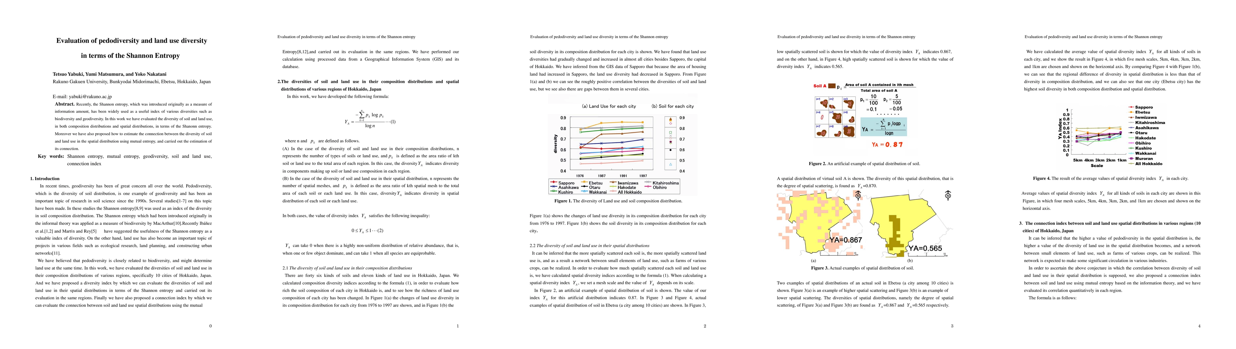 This paper evaluates soil (pedodiversity) and land use diversity using Shannon entropy, assessing both composition and spatial distributions. It also proposes a method to estimate the relationship between soil and land use diversity through mutual entropy.