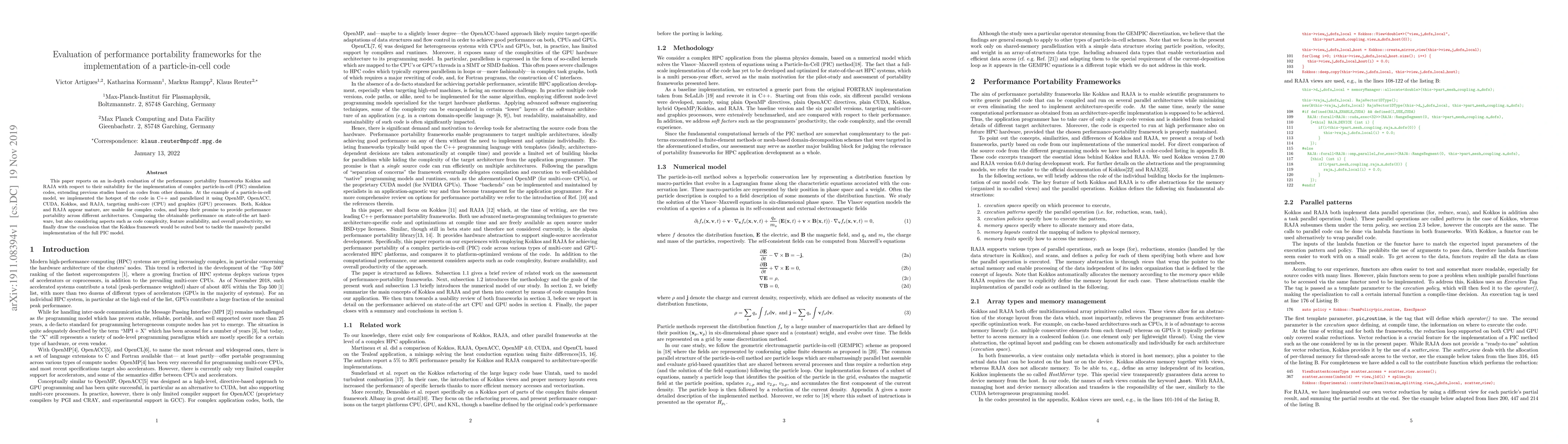 This paper evaluates Kokkos and RAJA frameworks for implementing a particle-in-cell (PIC) simulation code, finding both frameworks mature and effective for performance portability across architectures. Kokkos is ultimately deemed more suitable for the complex, massively parallel implementation of the PIC model due to its balance of performance and productivity.
