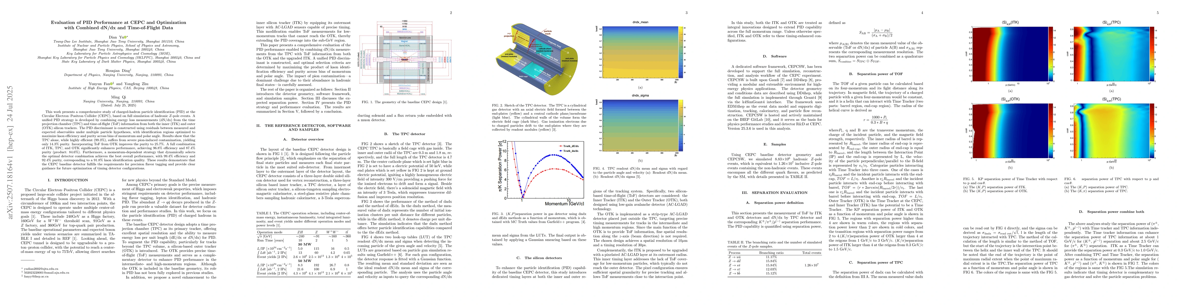 This work presents a comprehensive study of charged-hadron particle identification (PID) at the Circular Electron-Positron Collider (CEPC), based on full simulation of hadronic $Z$-pole events. A unified PID strategy is developed by combining energy loss measurements (dN/dx) from the time projection chamber (TPC) and time-of-flight (ToF) information from both the inner (ITK) and outer (OTK) silicon trackers. The PID discriminant is constructed using residuals between measured and expected observables under multiple particle hypotheses, with identification regions optimized to maximize kaon efficiency and purity across bins of momentum and polar angle. Results show that the TPC alone, while highly efficient (99.3%), suffers from severe pion-induced contamination, yielding only 14.3% purity. Incorporating ToF from OTK improves the purity to 25.7%. A full combination of ITK, TPC, and OTK significantly enhances performance, achieving 96.8% efficiency and 87.4% purity (product: 84.6%). Furthermore, a momentum-dependent strategy that dynamically selects the optimal detector combination achieves the best overall performance, with 99.4% efficiency and 92.4% purity, corresponding to a 91.8% kaon identification quality. These results demonstrate that the CEPC baseline detector fulfills the requirements for precision flavor tagging and provide clear guidance for future optimization of timing detector configurations.